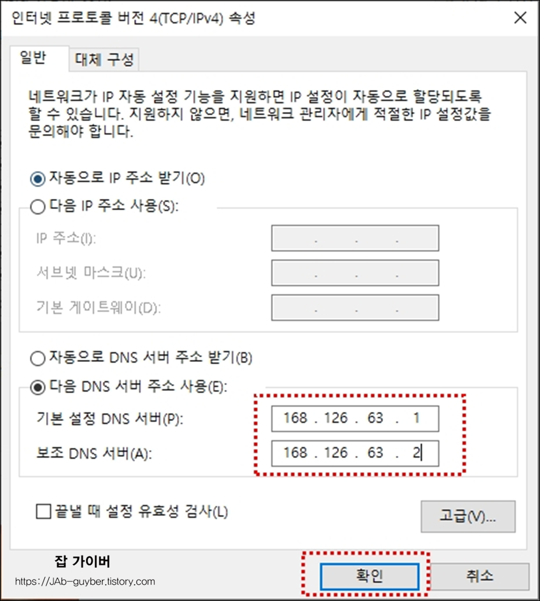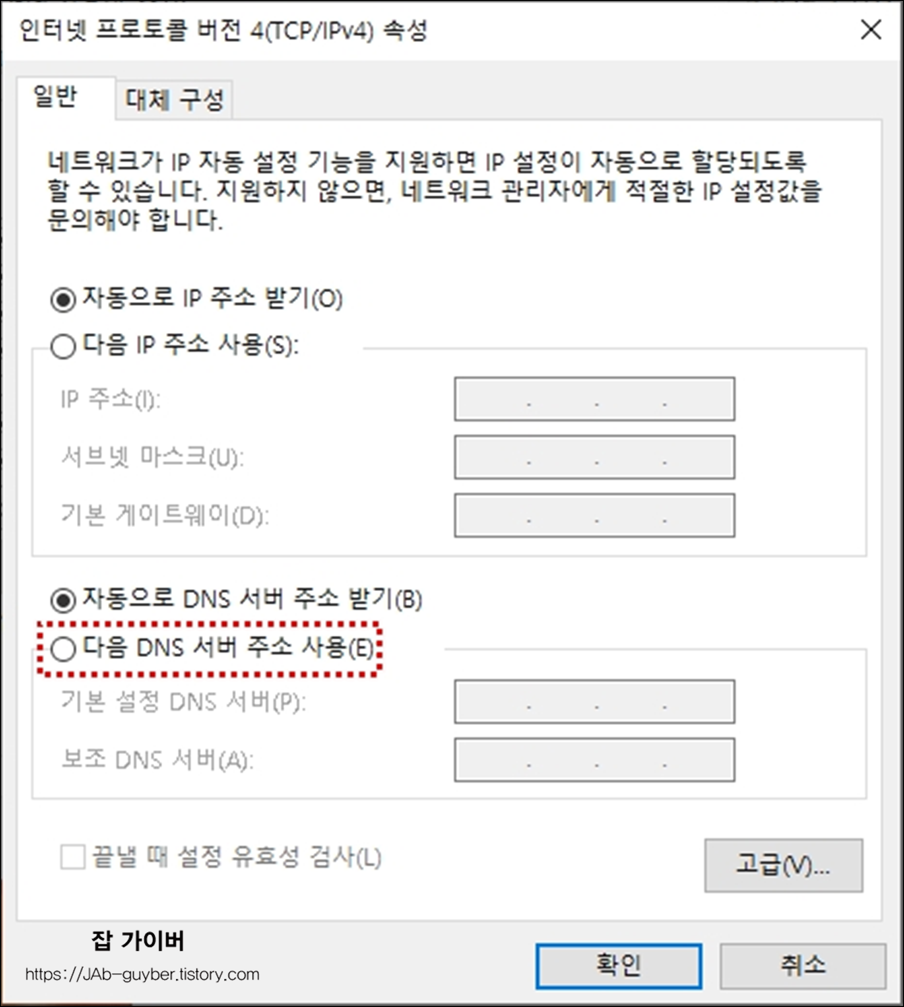 기본값은 보통 “DNS 서버 주소 자동으로 받기”로 되어 있습니다. 여기서 다음 DNS 서버 주소 사용을 선택해 수동으로 입력할 수 있습니다.