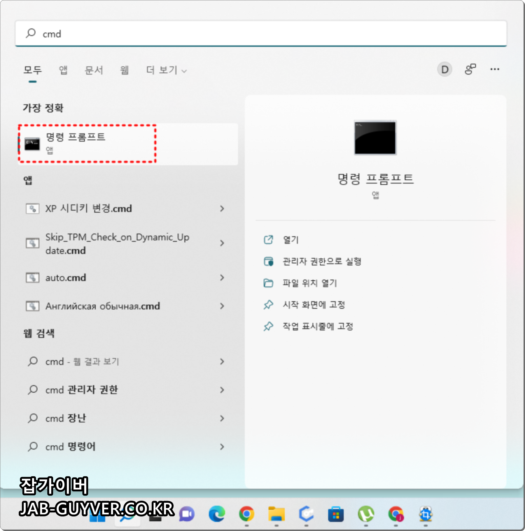 CMD 또는 명령 프롬프트를 관리자 권한으로 실행합니다. 윈도우11이든 윈도우10이든 검색창에서 “cmd” 검색 후 마우스 오른쪽 버튼을 눌러 관리자 권한으로 실행을 선택하면 됩니다.