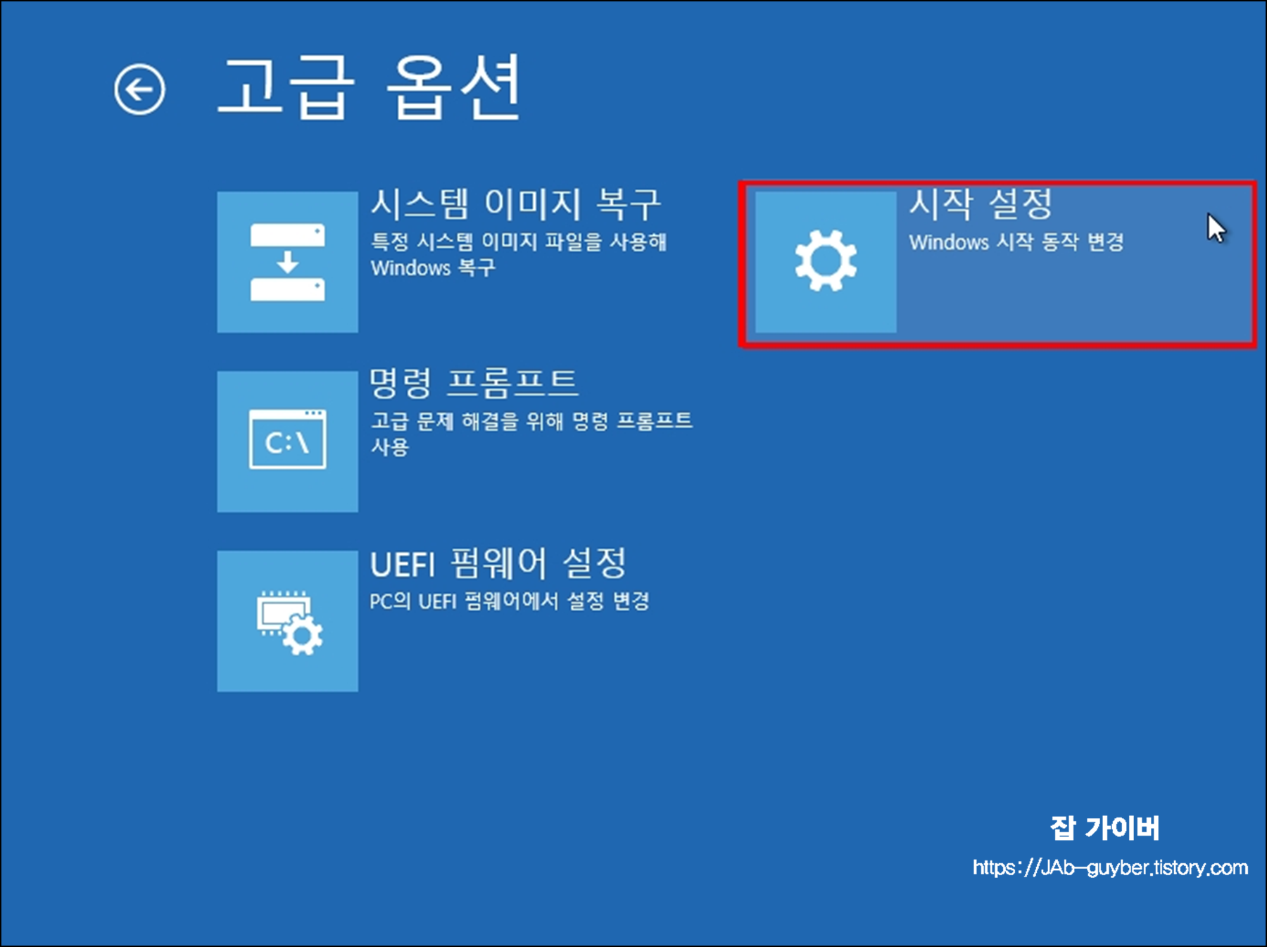 여기서 시작 설정을 누르면 “다음 부팅에서 어떤 모드로 들어갈지” 고를 수 있다.