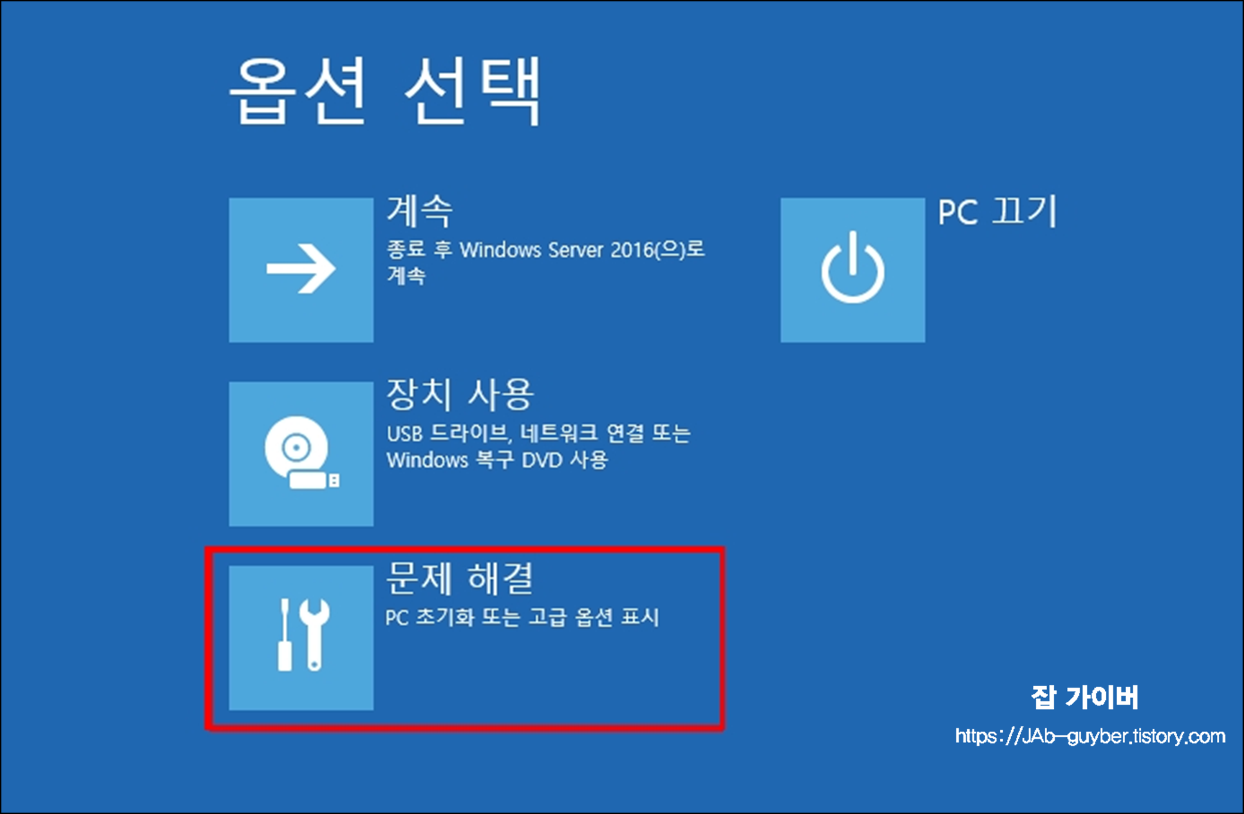복구 화면이 뜨면 옵션 선택에서 문제 해결로 들어간 뒤 고급 옵션을 선택한다.