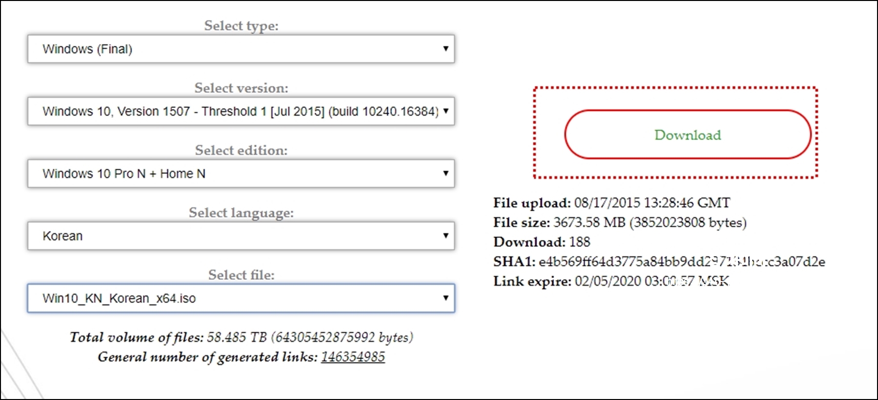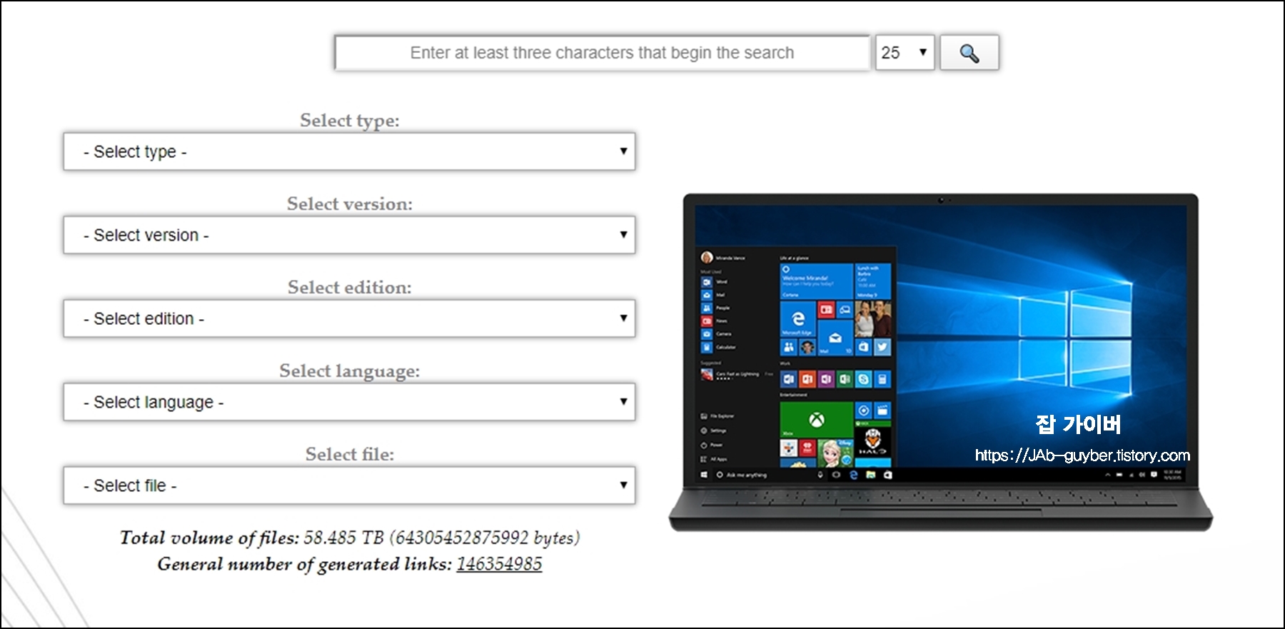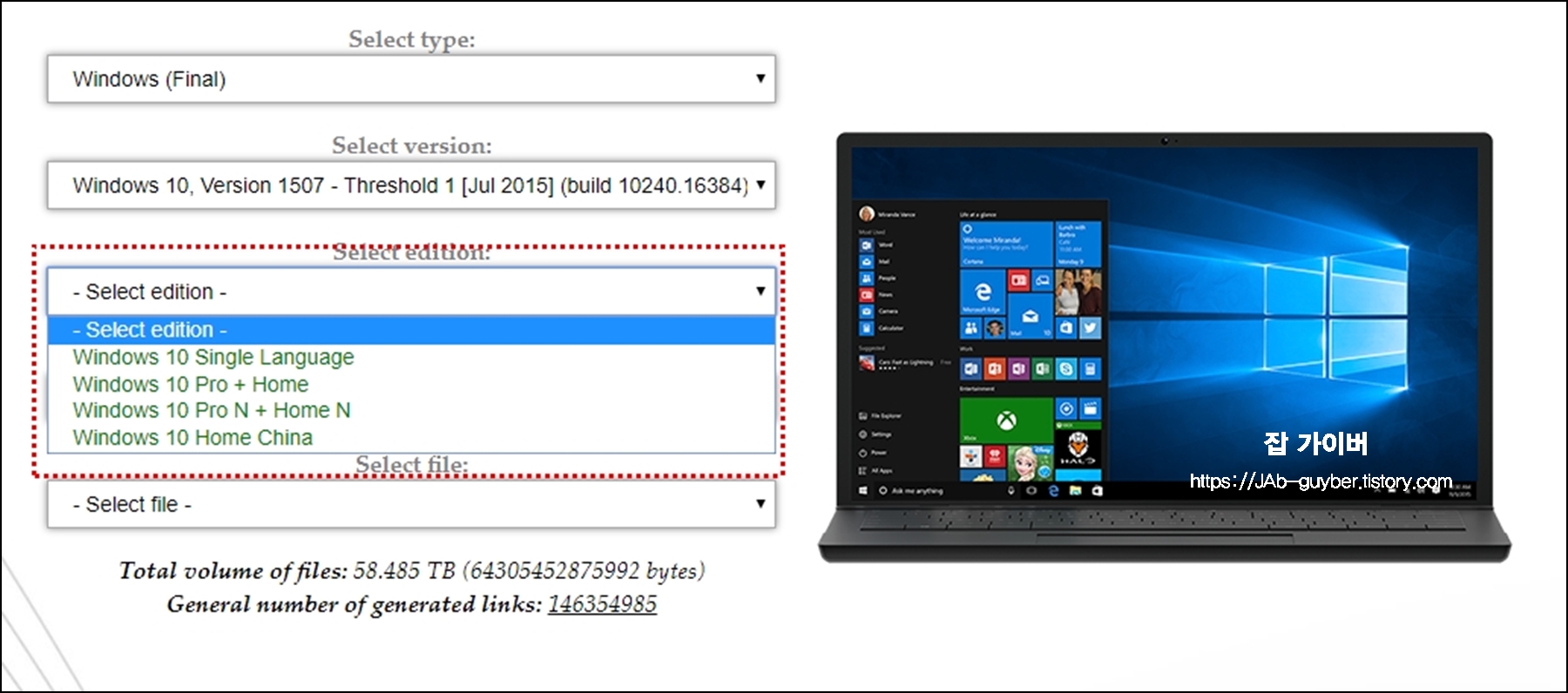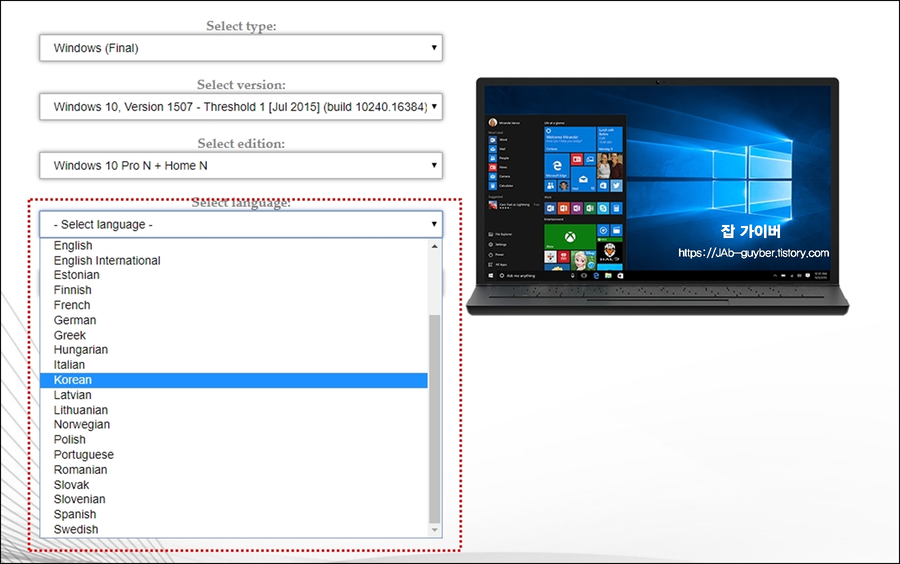 사이트에 접속한 모습으로 타입과 버전,에디션,언어,파일종류순으로 선택합니다.
