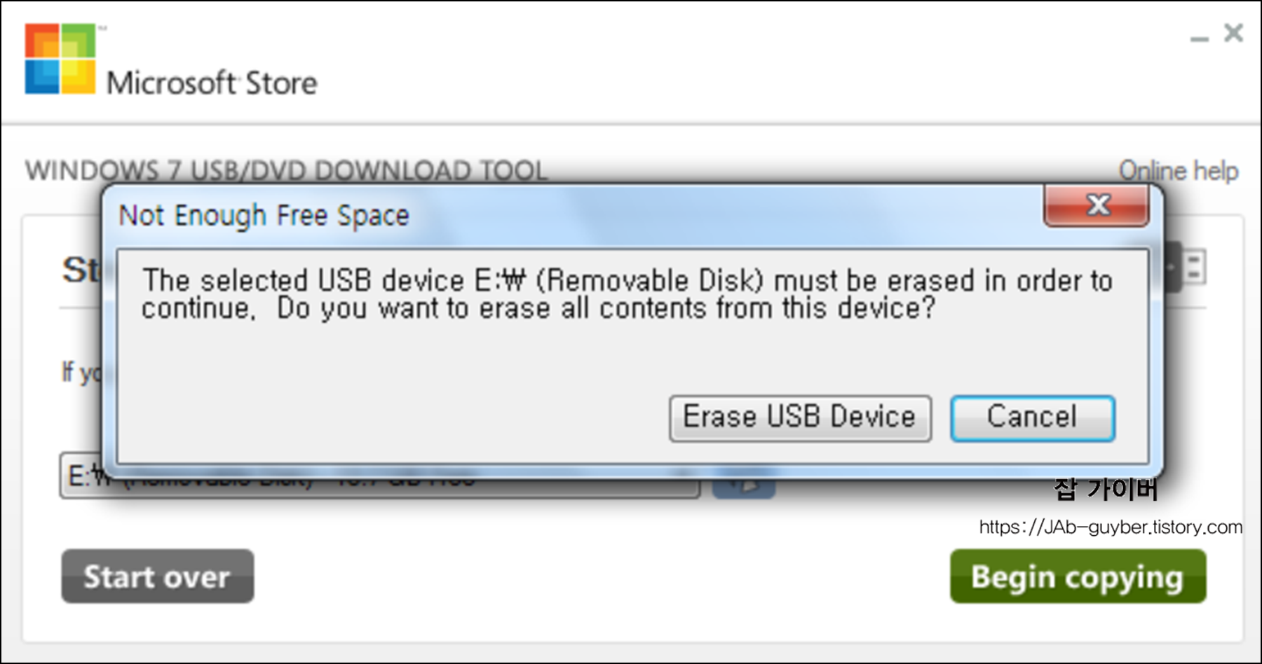 Erase USB Device 를 선택하면 USB 내의 모든 데이터가 포맷되고 부팅디스크로 만들어집니다.