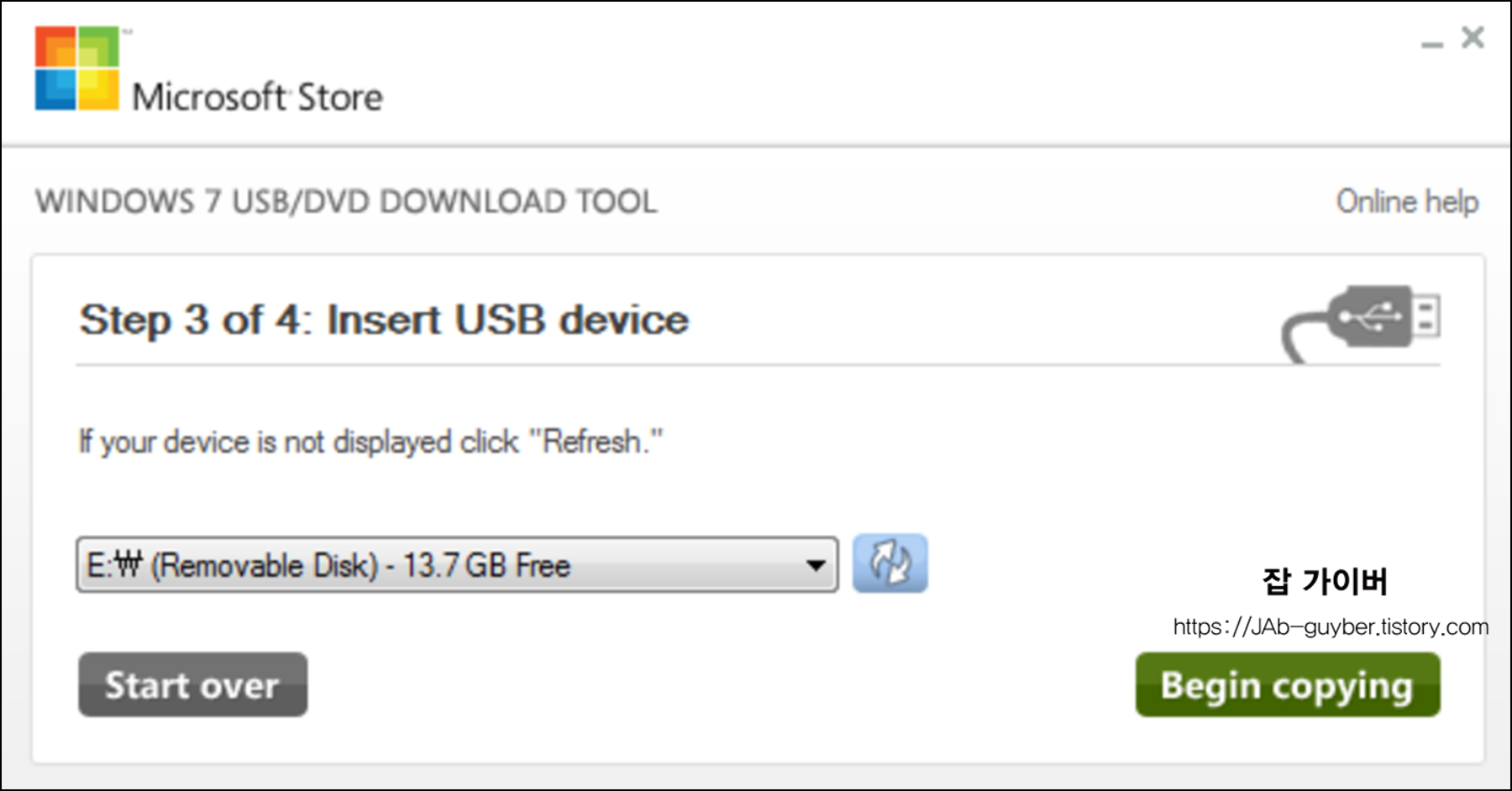 USB 드라이브를 선택 후 Begin Copying 선택