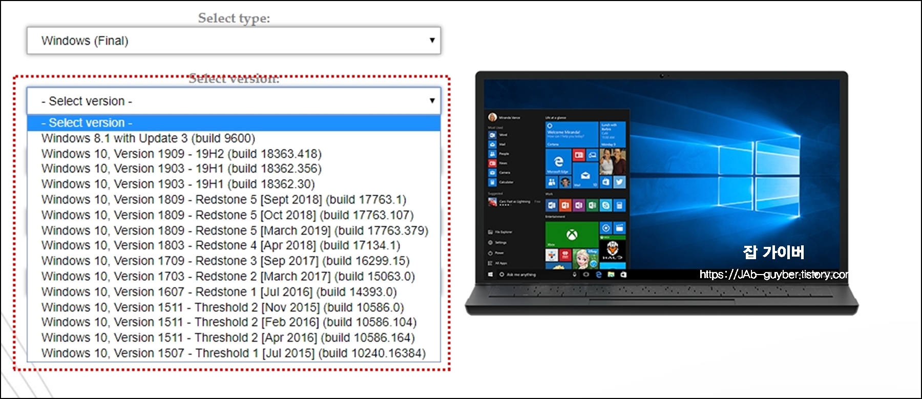 최종버전의 윈도우10 버전별로 1909~1507버전까지 제공합니다.
