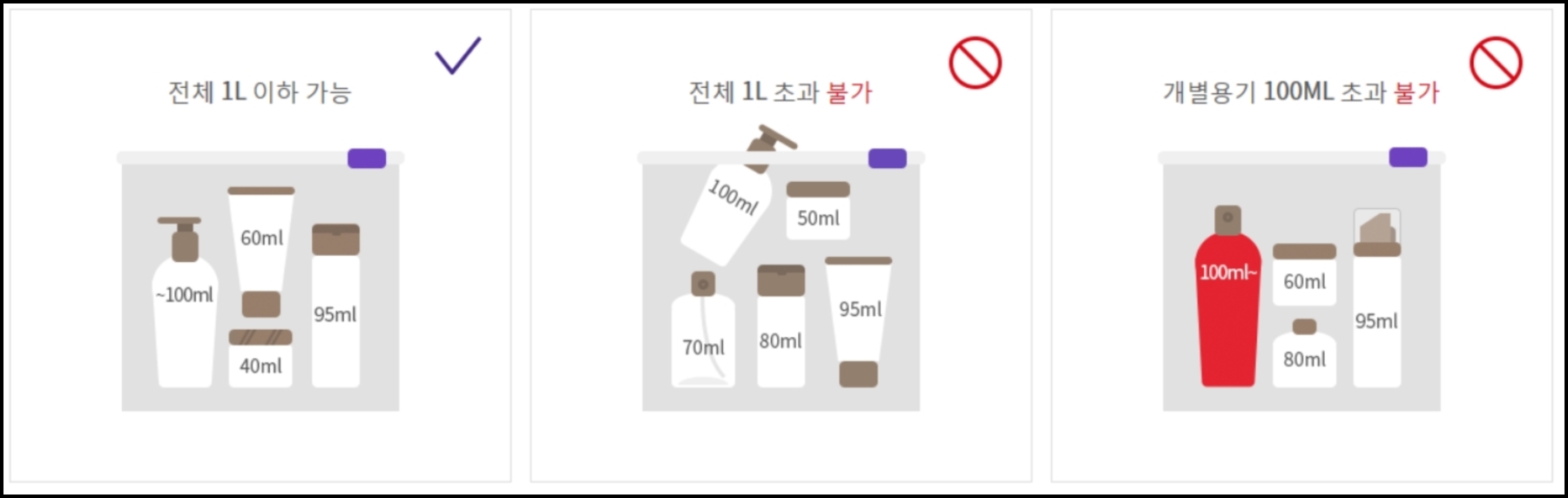 국내선은 비교적 자유롭지만 국제선의 경우 100ml 이하 용량의 액체류만 허용돼요. 1인당 1L 투명 지퍼백 1개에만 담아야 하며, 모든 액체는 별도 보안 검색대에서 검사 대상이에요.