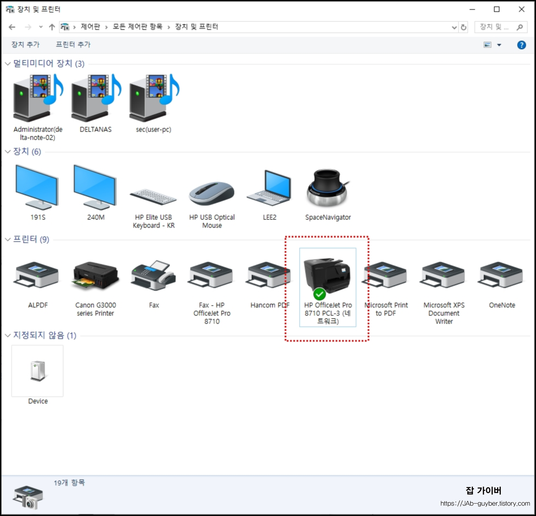저는 HP 프린터를 주로 사용하기 때문에 해당 프린터를 기본프린터 설정했습니다.