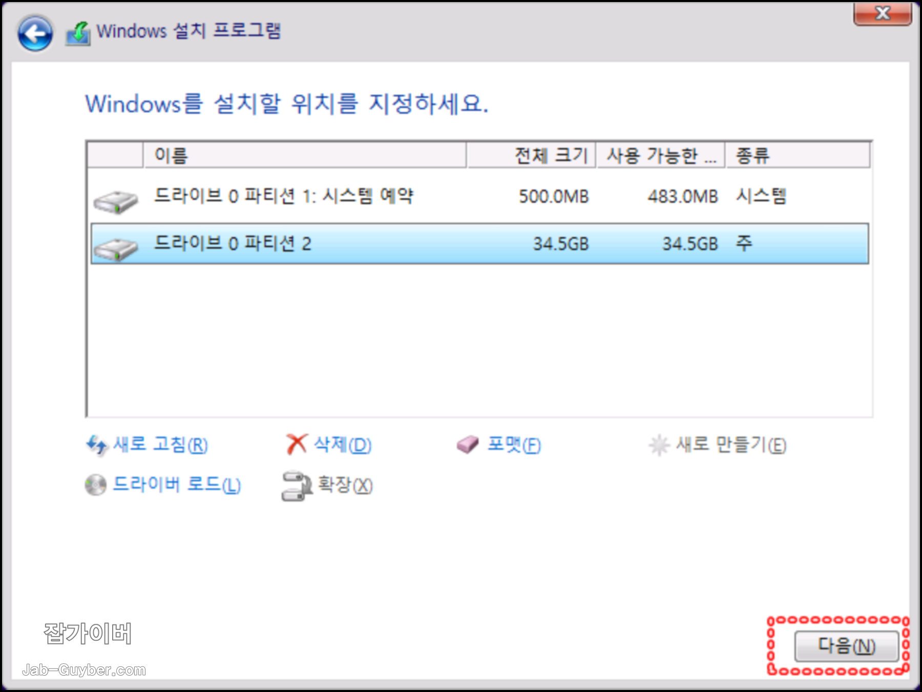 보는것과 같이 컴퓨터를 모두 포맷한 상태라면 "새로 만들기" 선택해 하드디스크의 파티션을 할당합니다.