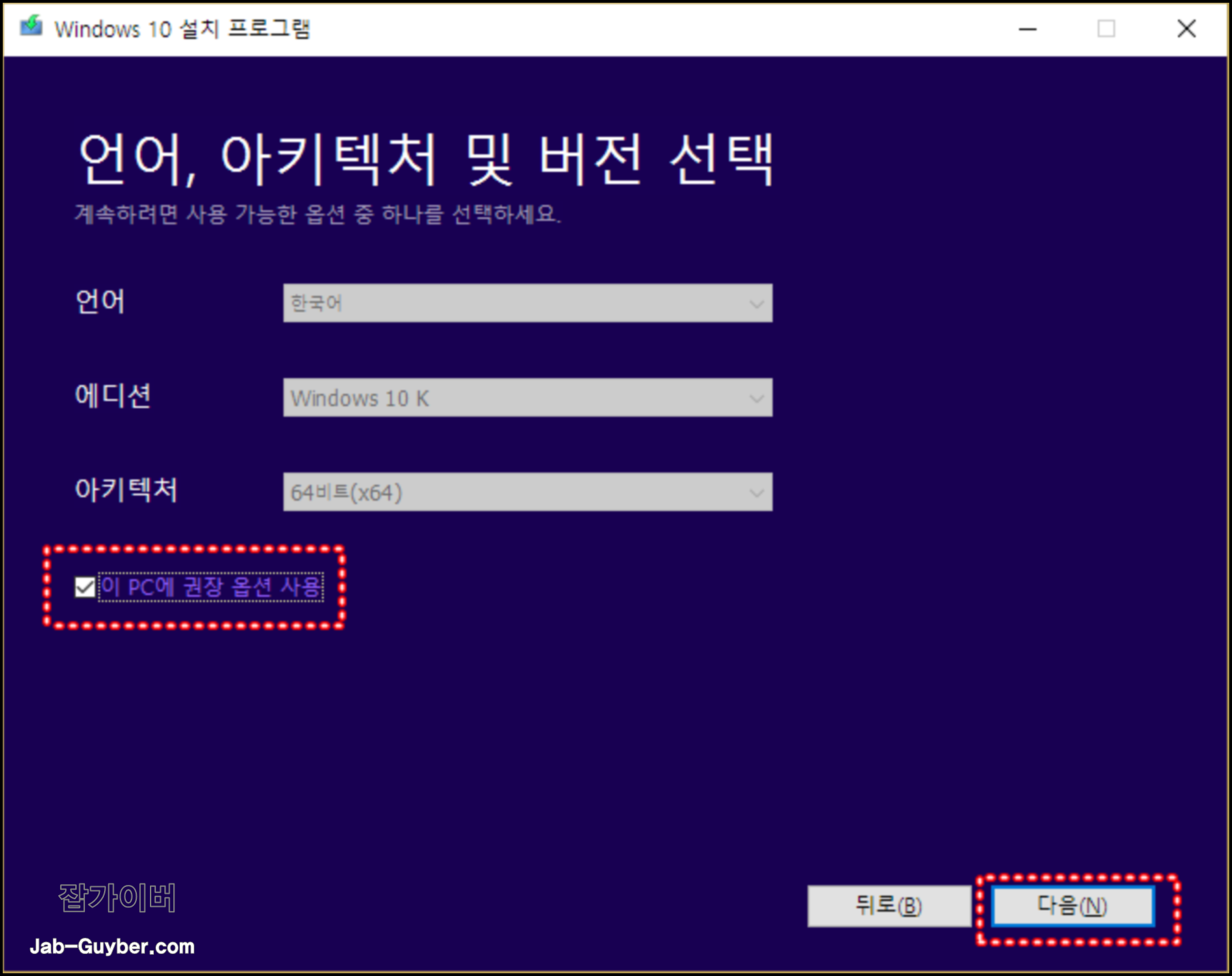 언어 및 아키테처에서는 윈도우10 설치 언어 및 에디션,아키텍쳐를 선택할 수 있으며 기본적으로 "이 PC에 권장 옵션사용"을 선택 후 다음을 선택합니다.