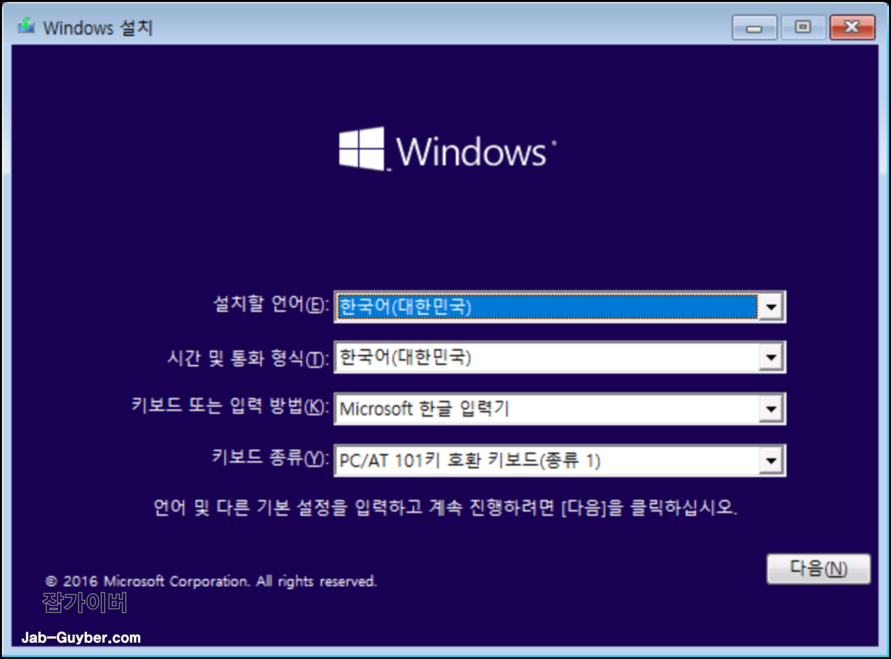 여기서 윈도우10의 설치 언어 및 시간, 키보드설정을 할 수 있으며 모든 작업이 완료되었다면 "다음" 선택합니다.