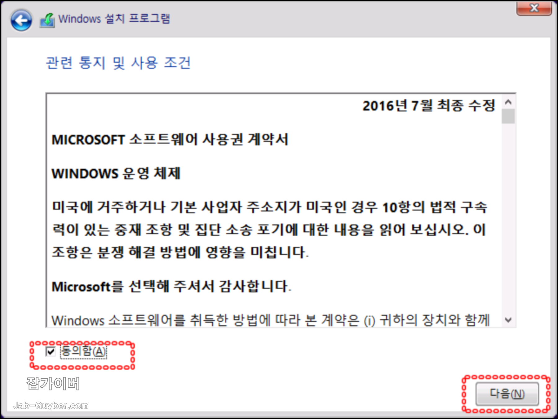 윈도우10의 통지 및 사용조건을 확인 후 동의합니다.