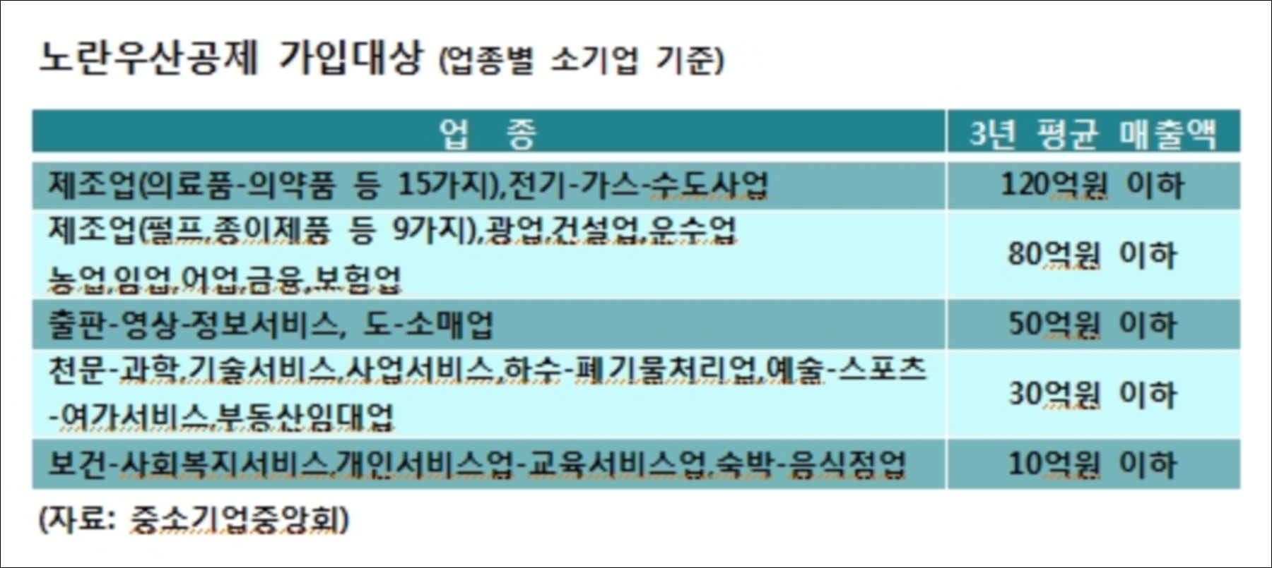 | 소기업 | 업종별 3년 평균 매출액 일정수준 이하 업체 |