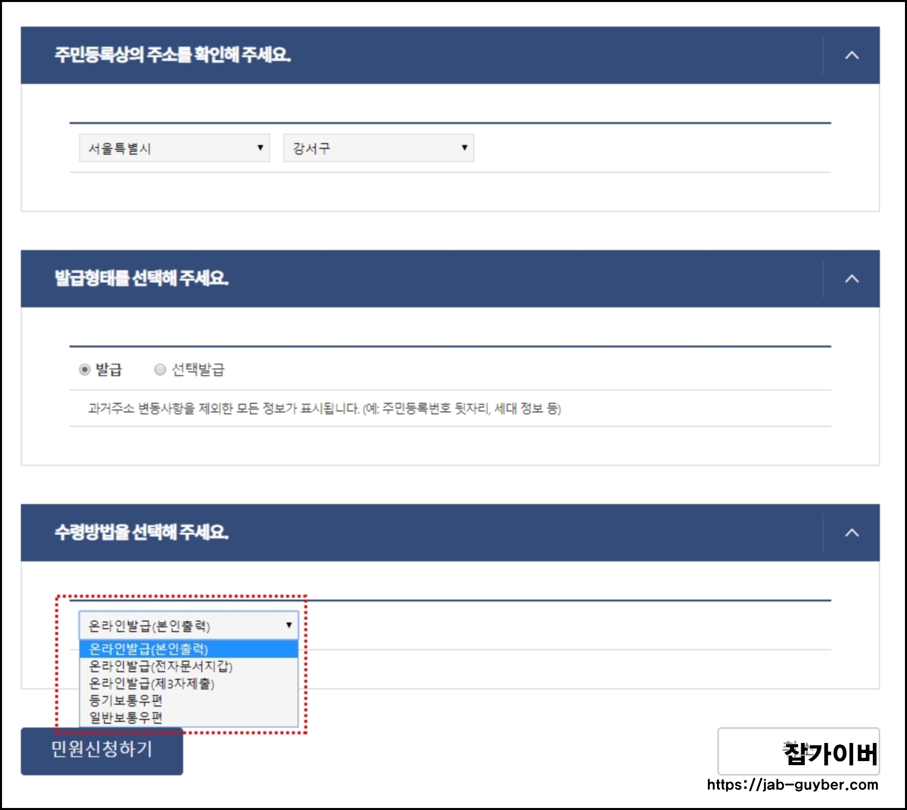 주민등록상 주소와 발급형태를 선택하고 수령방법을 5가지중에 선택합니다.