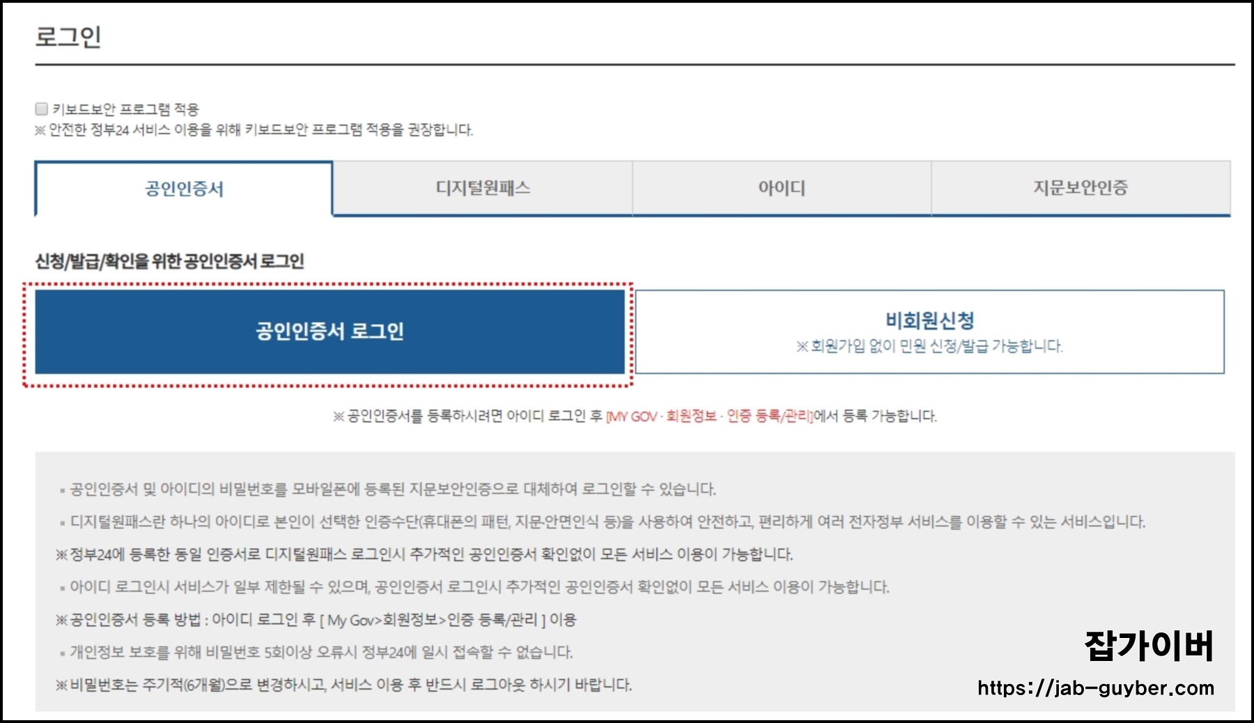 기본적으로 공인인증서 로그인을 선택하며 비회원도 신청이 가능합니다.