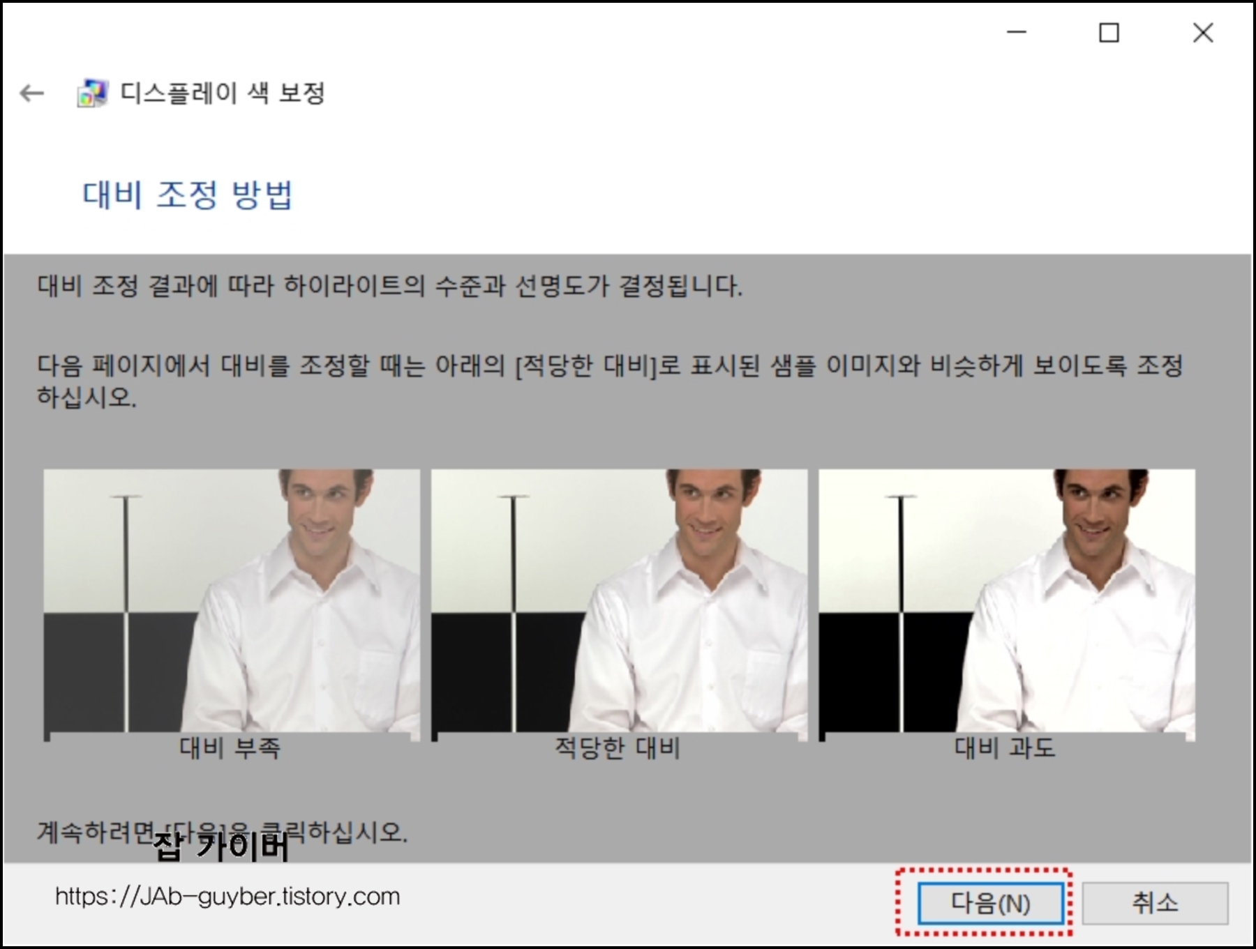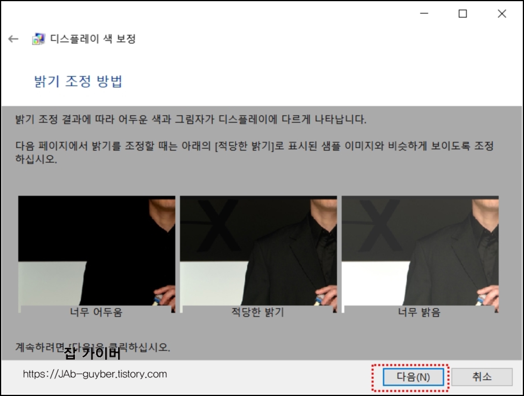예시에서 보듯이 적당한 수준으로 밝기와 대비를 조정합니다.
