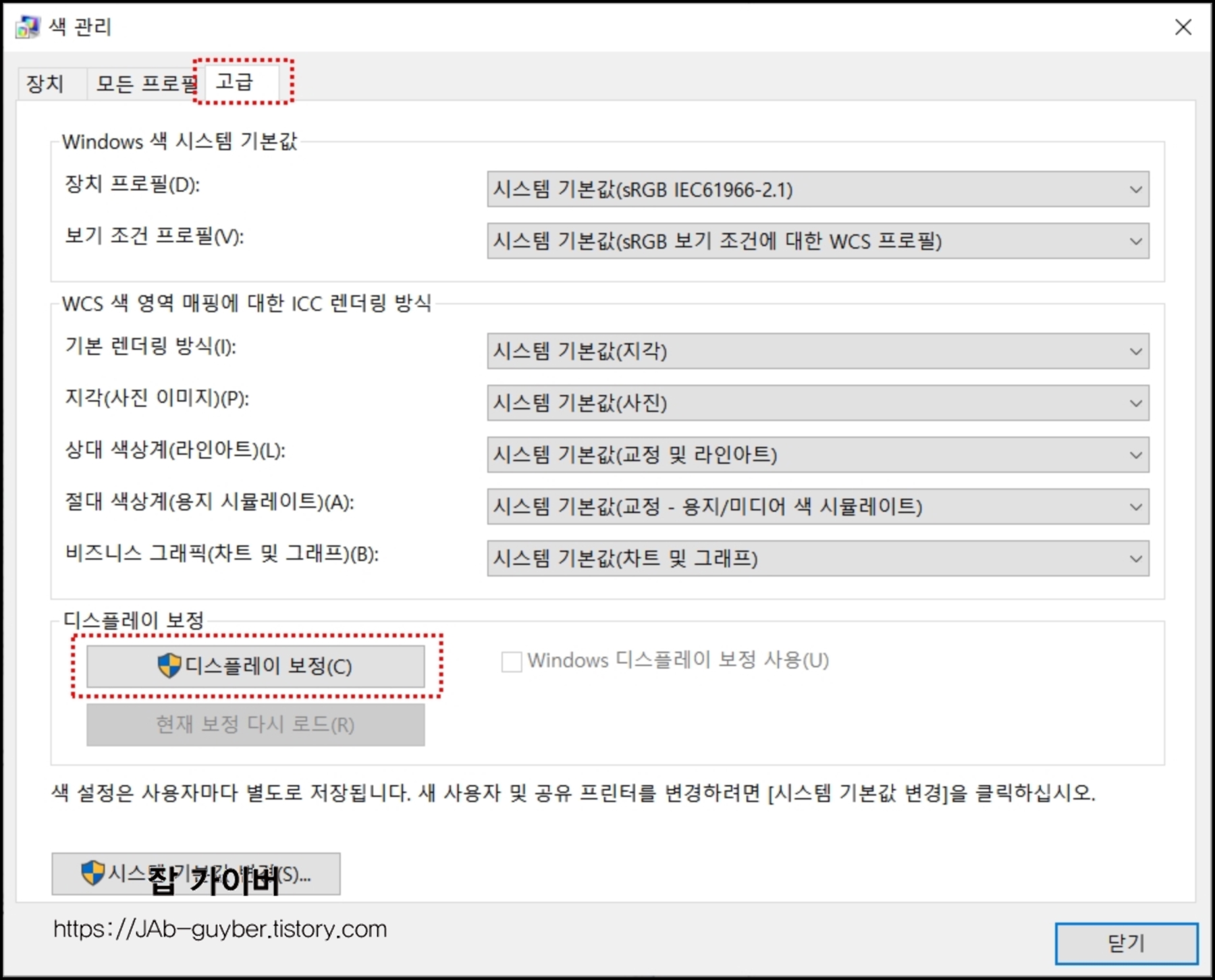 고급 -> 디스플레이 보정을 선택합니다.