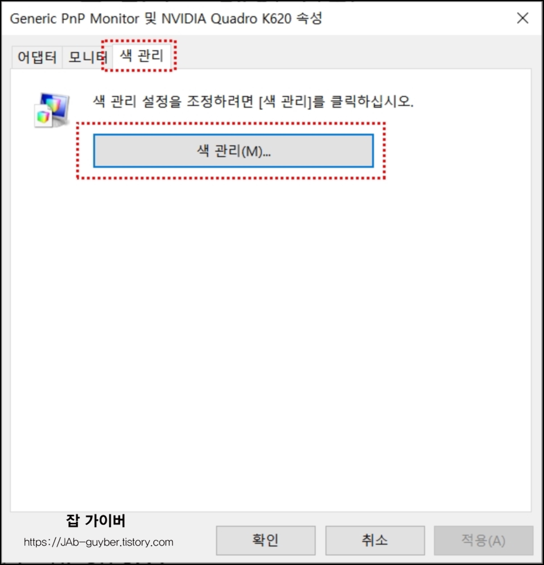 디스플레이 어뎁터 속성을 표시 -> 색 관리를 선택합니다.
