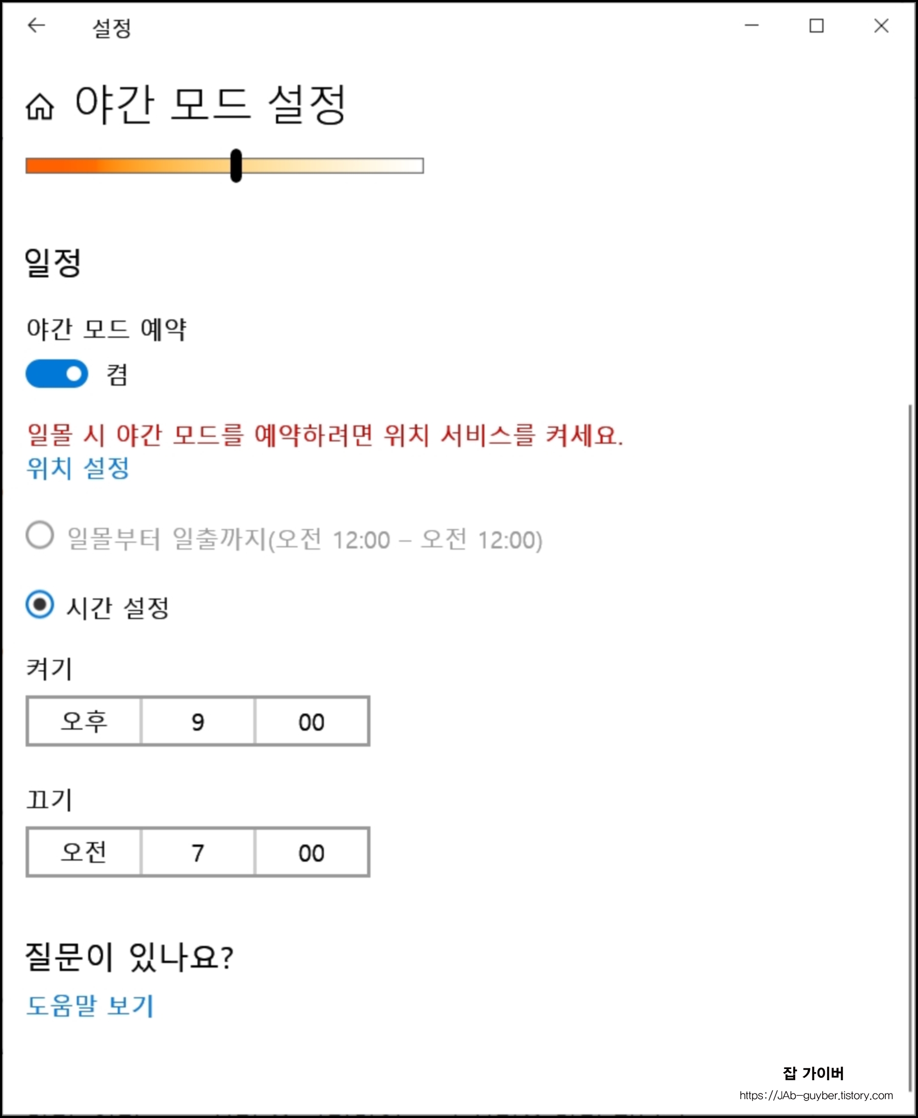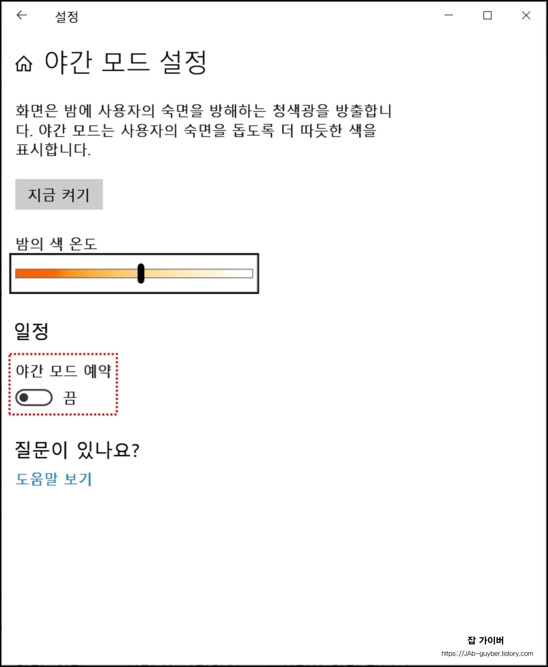 기본값으로 설정된 밤의 색온도를 체크 후 눈이 피로하다면 야간모드를 바로 실행해서 사용하는 것도 좋습니다.