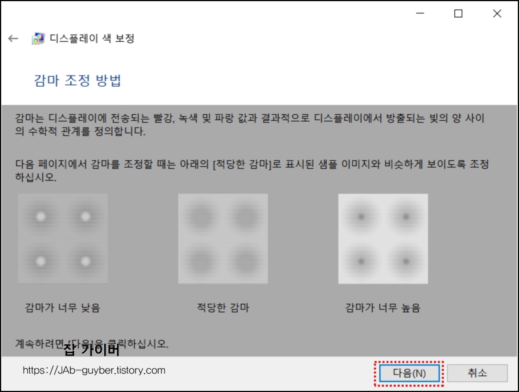 기본 색 설정 및 감마 조정을 윈도우10 자체 기능을 통해 설정할 수 있습니다.