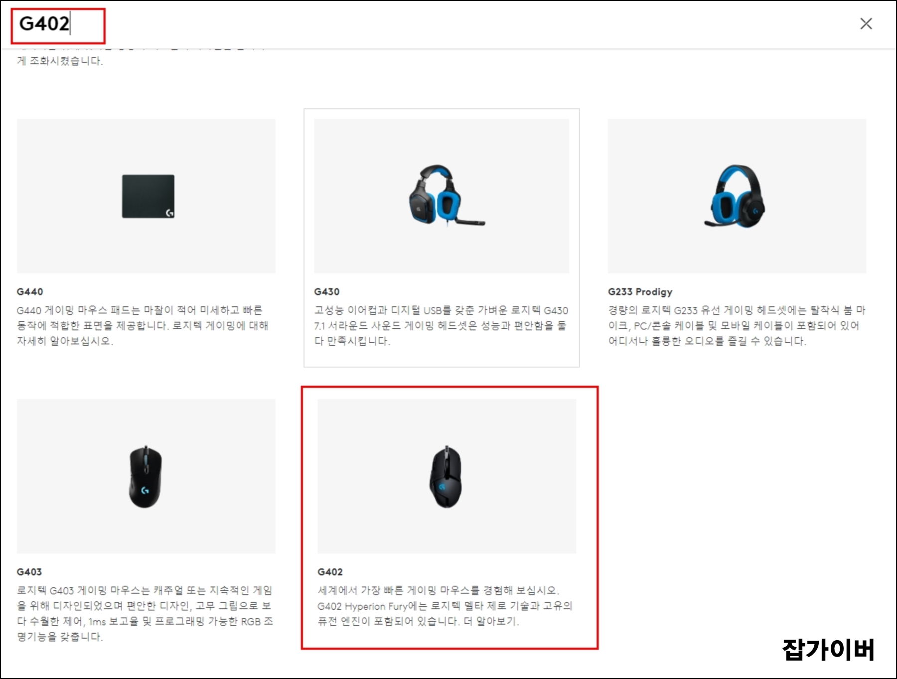 저는 로지텍 G402 드라이버를 다운로드 받기 위해 검색했으며 검색결과 G402와 G403 외에도 로지텍G430 모델과 G440모델도 함께 검색됩니다.