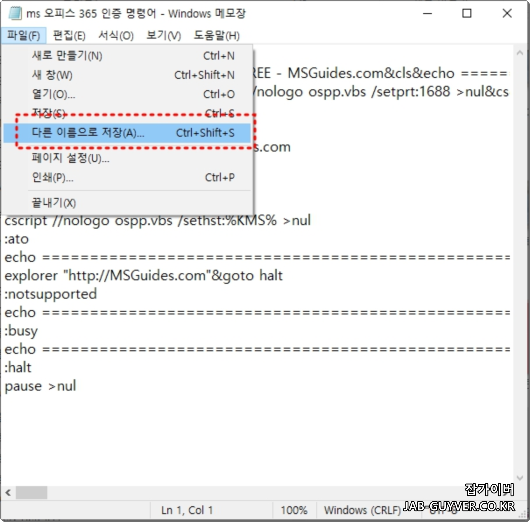 오피스 365 설치가 완료되었다면 아래 메모장 파일을 다운로드 받아 실행합니다.