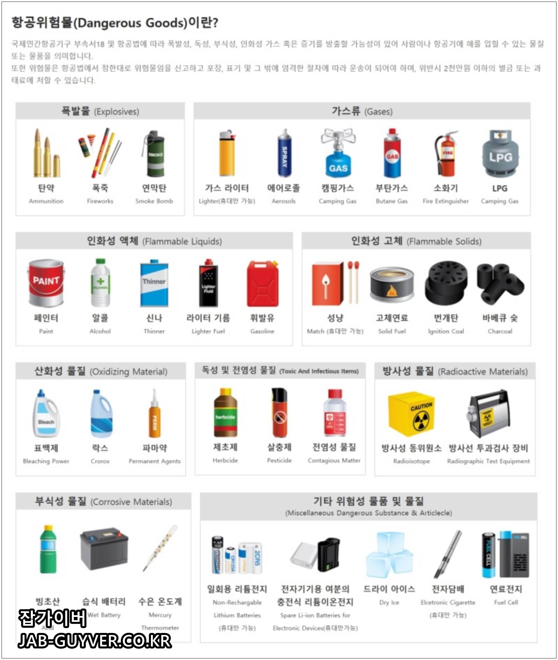 보통 이런 인화성 위험물질은 먼 여행을 떠날때 가지고 다니는 물건은 아니기 때문에 크게 걱정할 필요는 없지만 간혹 라이터나 성냥, 보조 배터리등 과 같은 전자기기, 전자담배, 일회용 건전지도 함께 포함되기 때문에 이런 부분은 비행기 탑승시 참고하세요