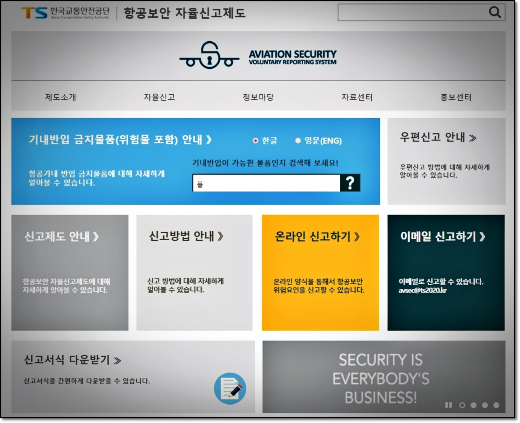 그 외 "항공보안 자율신고제도, 항공기내 반입금지 물품 홈페이지"를 참고하면 "항공보안 위험요인 신고, 비행기 반입금지 물품 검색 및 안내" 참고하세요