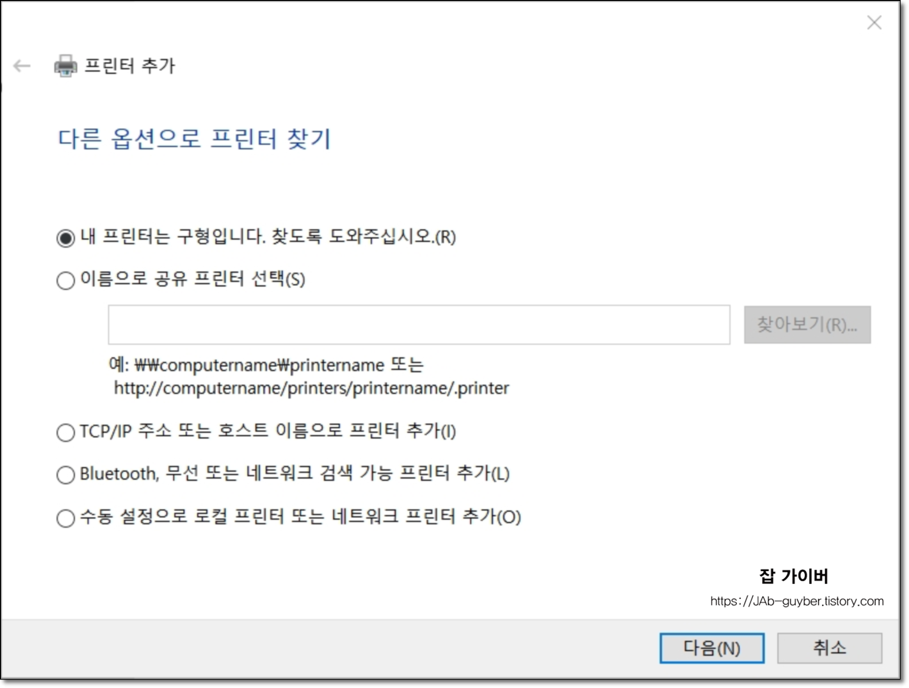 아래 내용대로 잡아두면 “원하는 프린터가 목록에 없습니다”가 떠도 당황할 일이 줄어든다.
