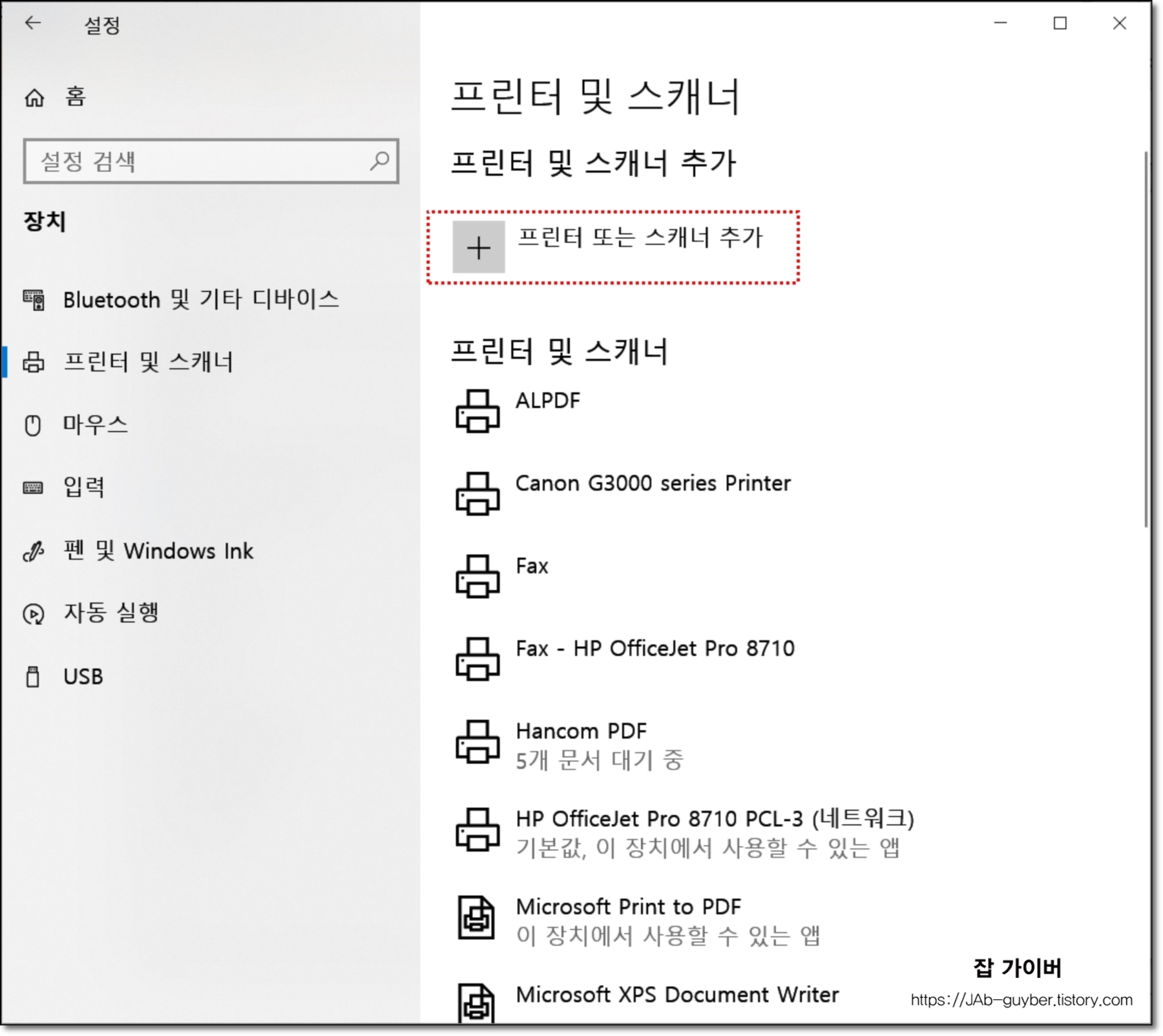 설정이 열리면 윈도우10은 “장치”, 윈도우11은 “Bluetooth 및 장치” 쪽에서 프린터 및 스캐너로 들어간다. 그리고 프린터 또는 스캐너 추가를 누른다.
