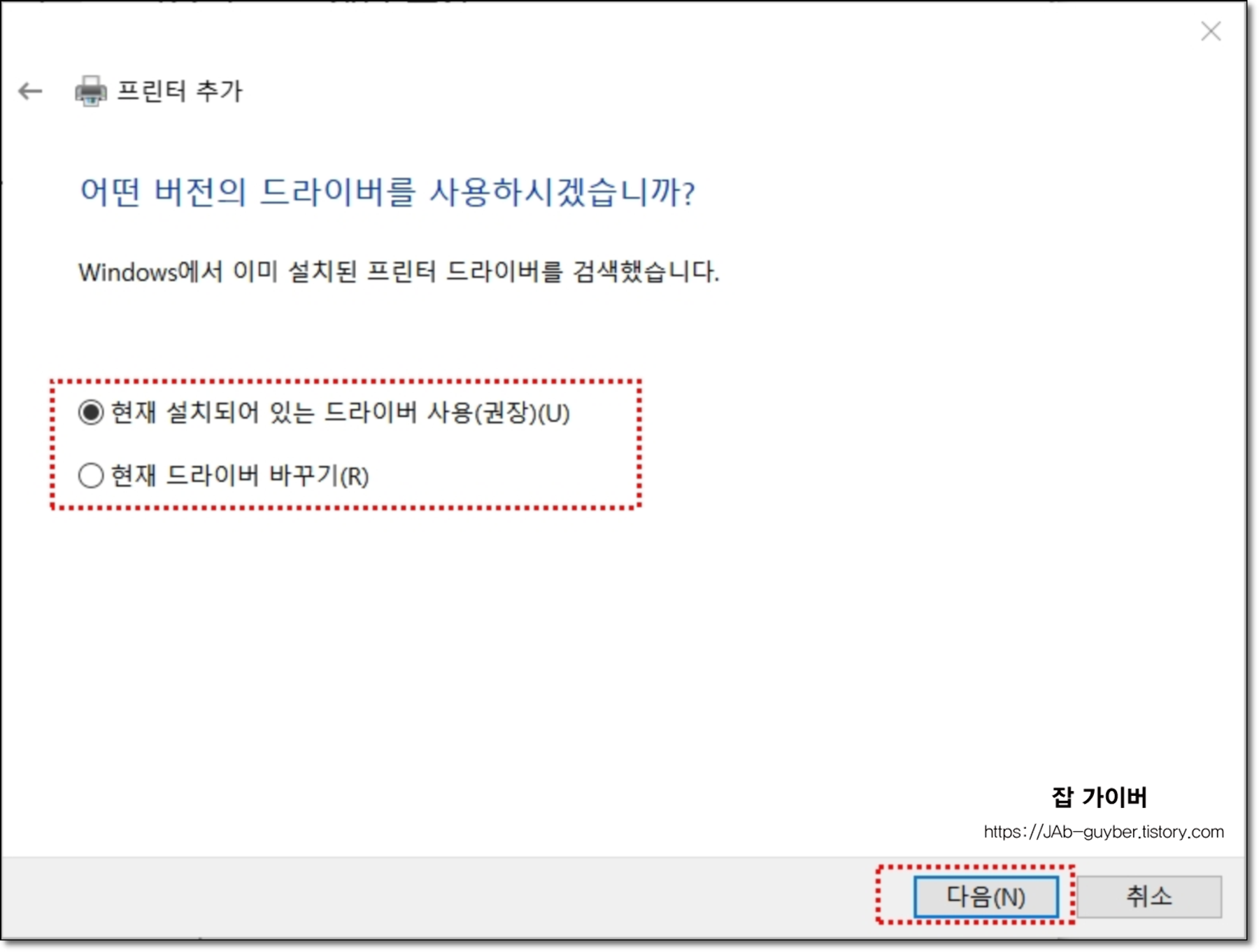 이미 설치된 장비라면 “현재 설치되어 있는 드라이버 사용”이 보이는 경우도 있다.