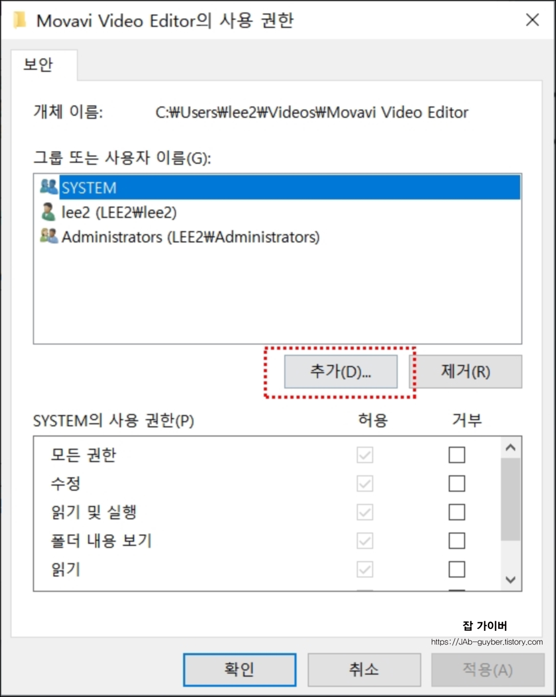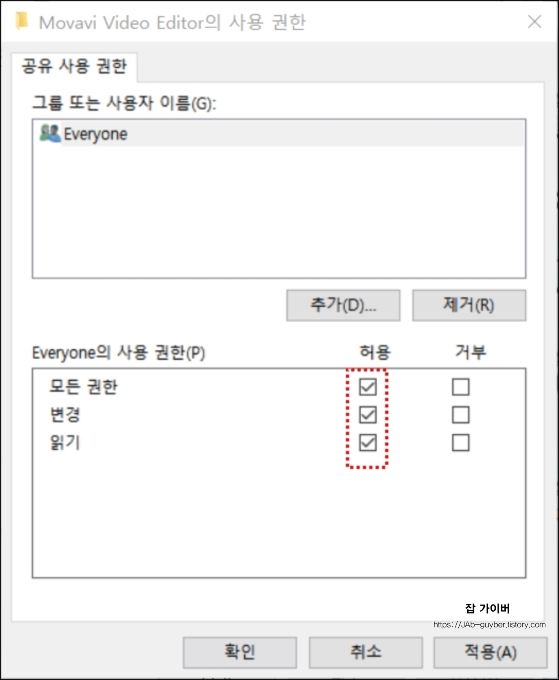 폴더에 대한 Everyone 사용권한을 읽기와 쓰기(변경) 기능에 대해 허용할 것인지 거부할 것인지 체크합니다.