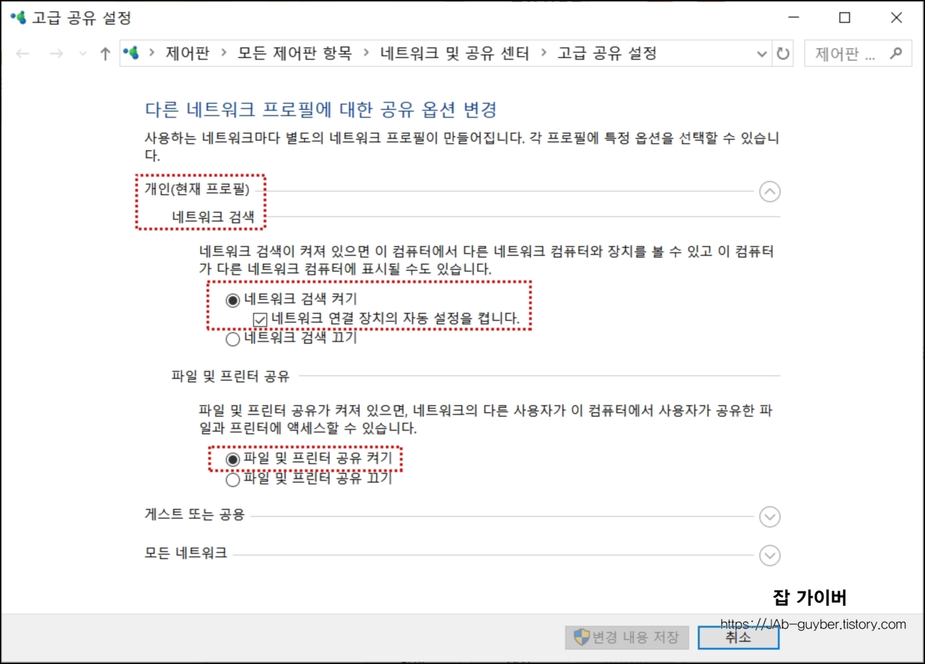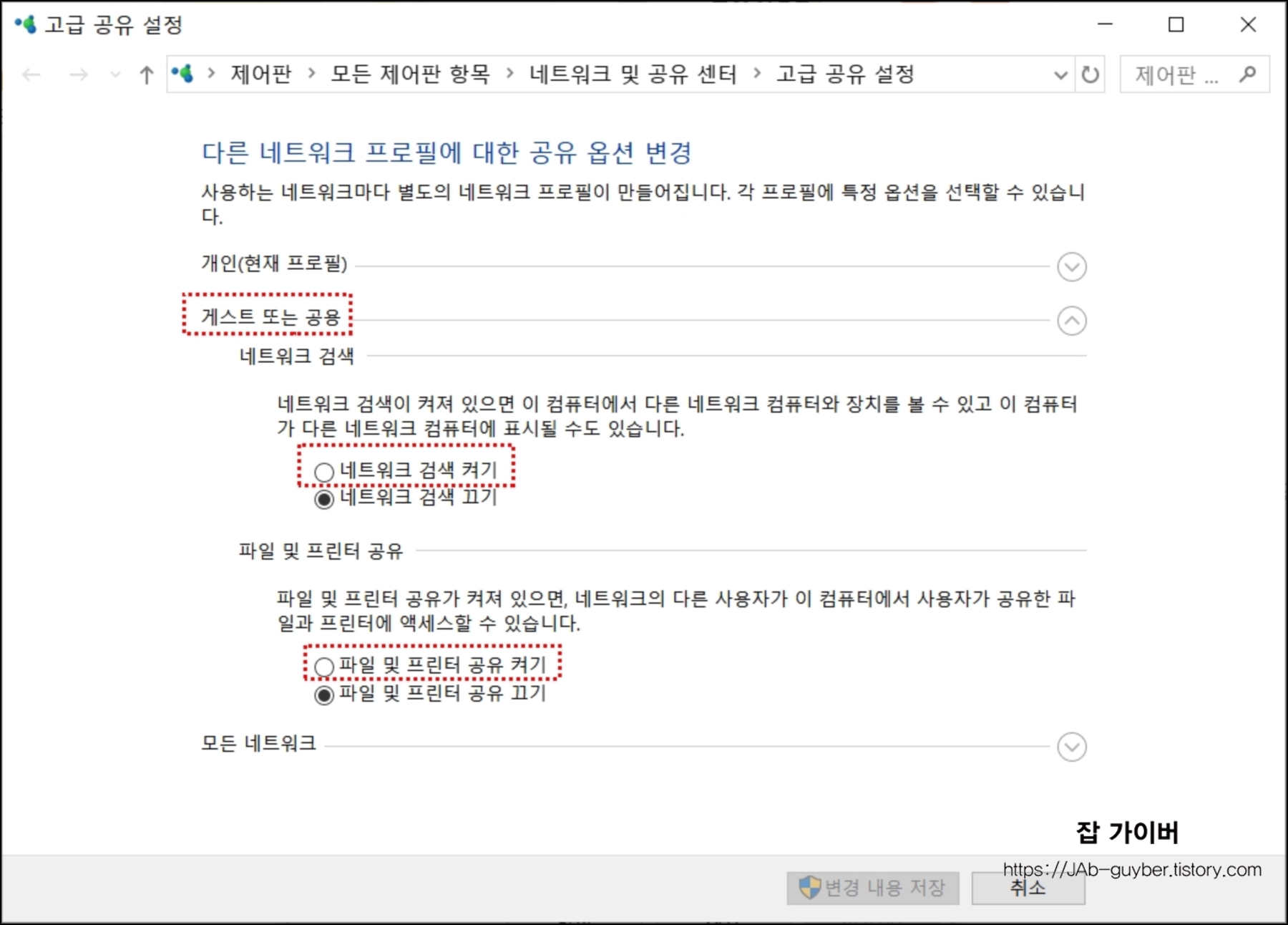 그 외에도 게스트 또는 공용 네트워크에 검색과 프린터 공유를 필요에 따라서 활성화 설정합니다.