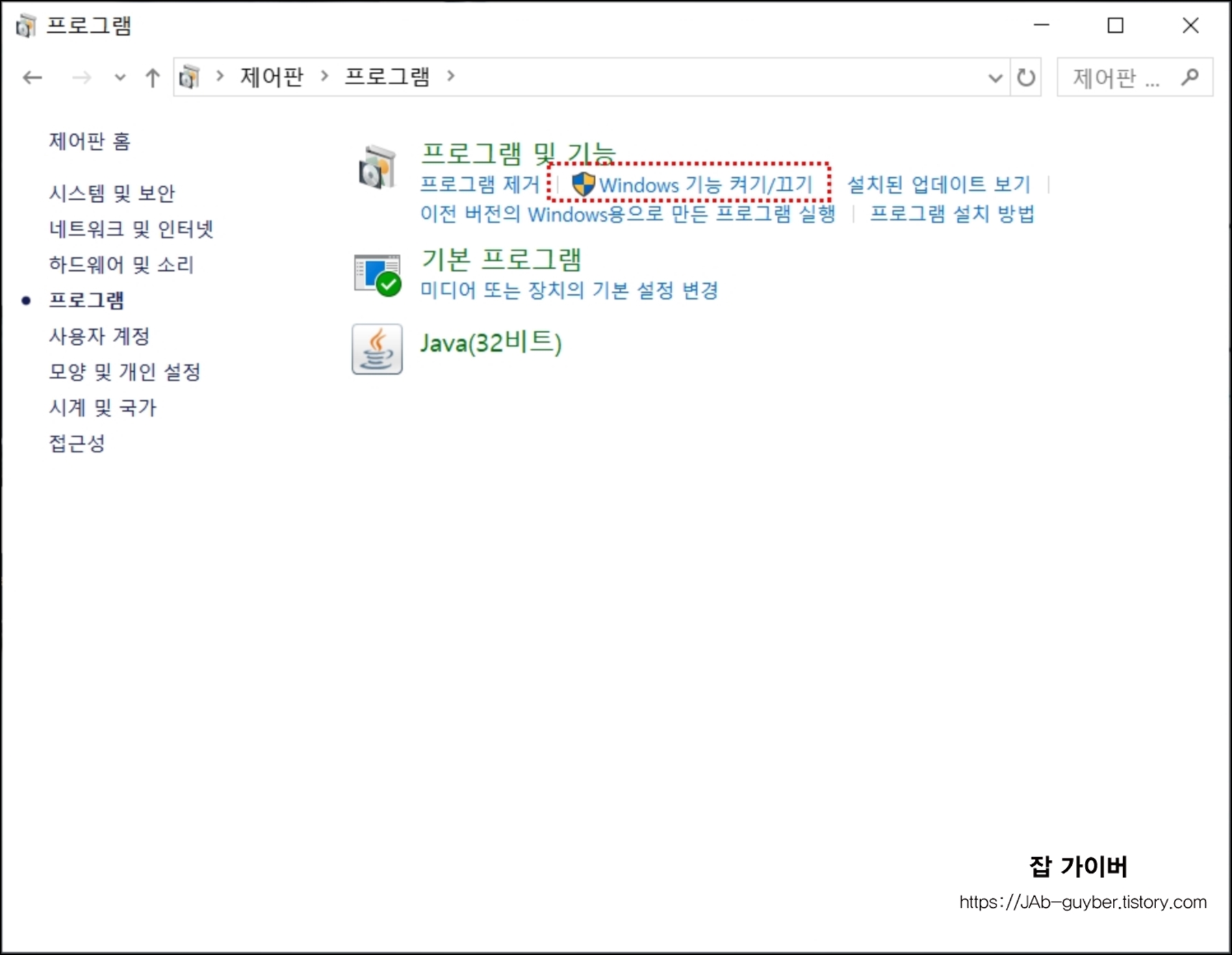 제어판 -> 프로그램 -> 윈도우 기능 켜기 / 끄기를 선택합니다.