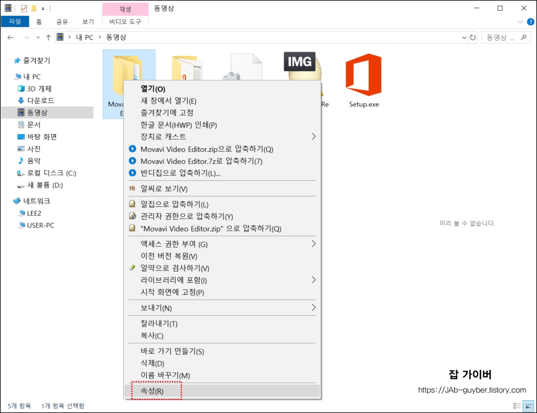 그리고 선택된 드라이브나 폴더.파일등을 선택 후 "속성"으로 들어갑니다.