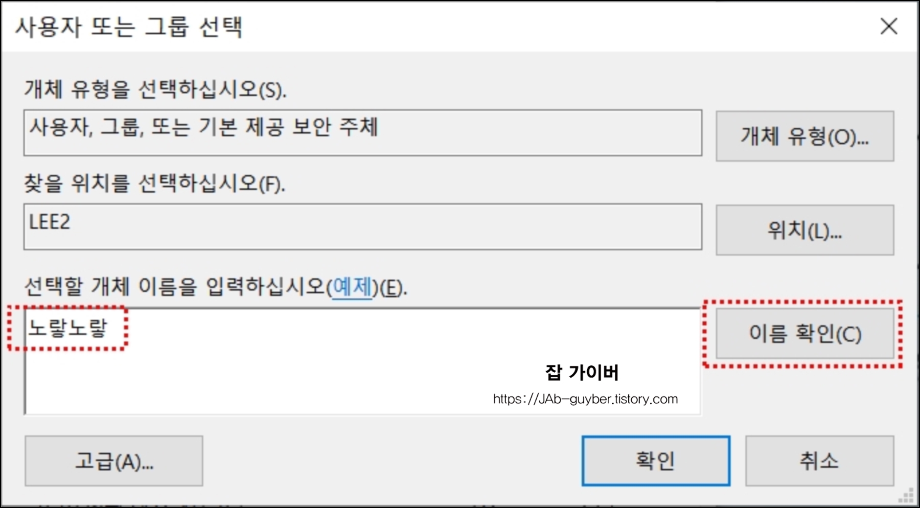 보안 항목에서 추가를 선택 후 객체 이름을 입력하고 이름 확인을 눌러줍니다.