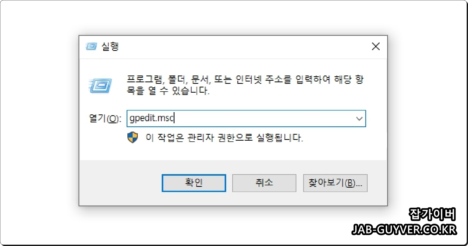 윈도우 키 + R을 눌러 실행창에 GPEDIT.MSC 입력 후 확인을 눌러 로컬그룹 정책편집기를 실행합니다.