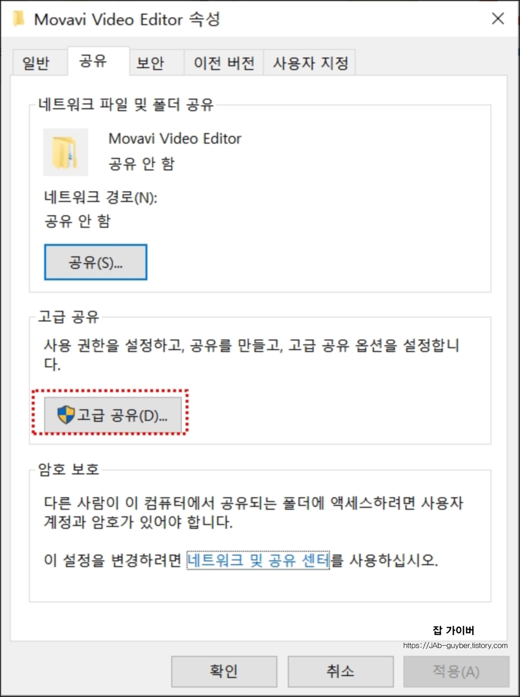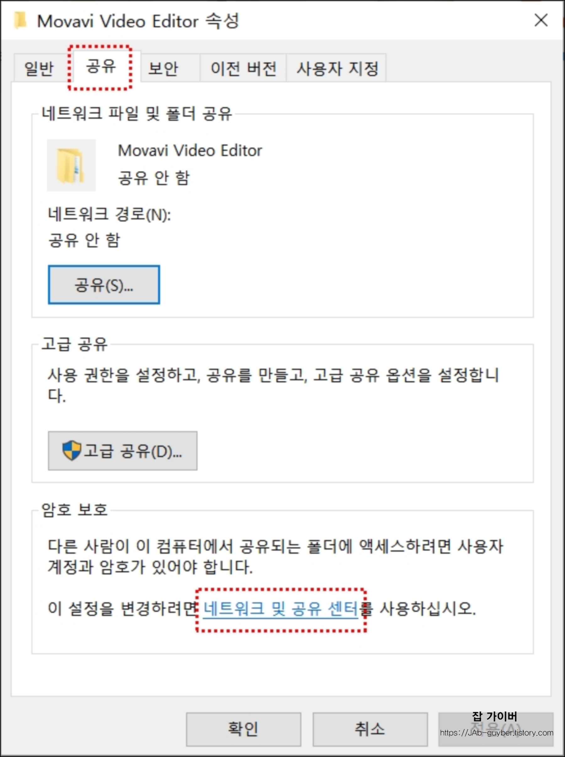 공유 탭이 현재 네트워크 파일 및 폴더 공유 상태를 보면 "공유안함"상태로 지정되어 있습니다.