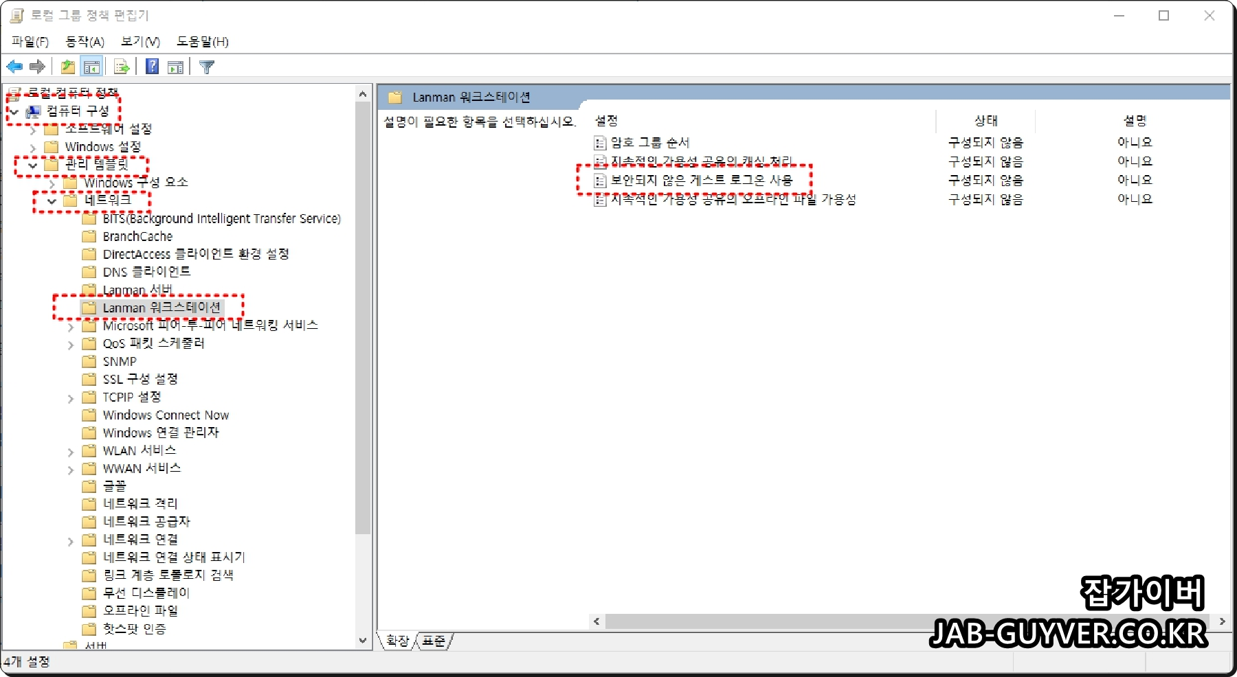 컴퓨터 구성 -> 관리템플릿 -> 네트워크 -> Lanman 워크스테이션으로 이동합니다.