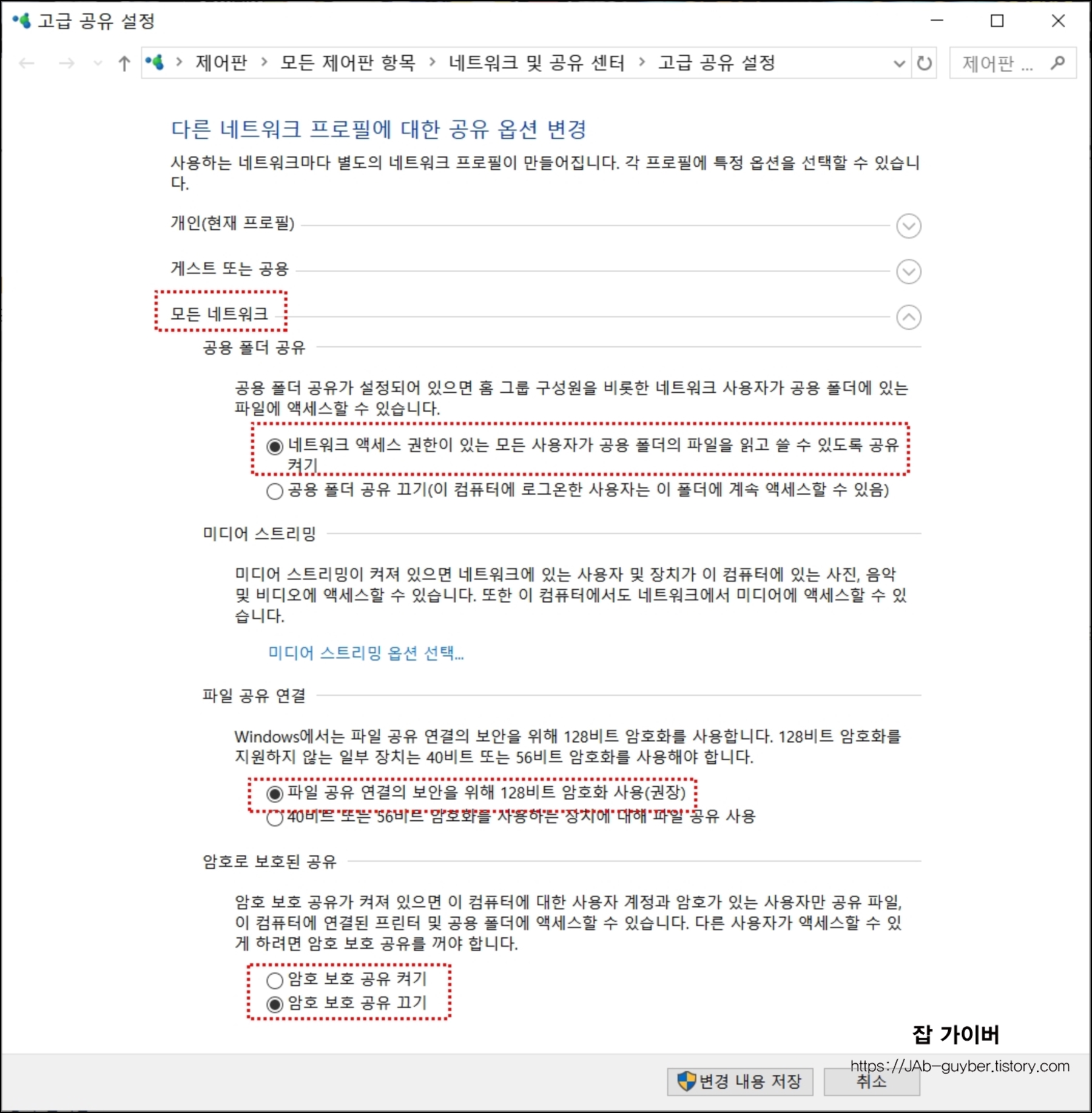 네트워크 공유폴더가 연결되지 않는 경우 가장 먼저 확인해야 할 사항은 네트워크 프로필 설정입니다.