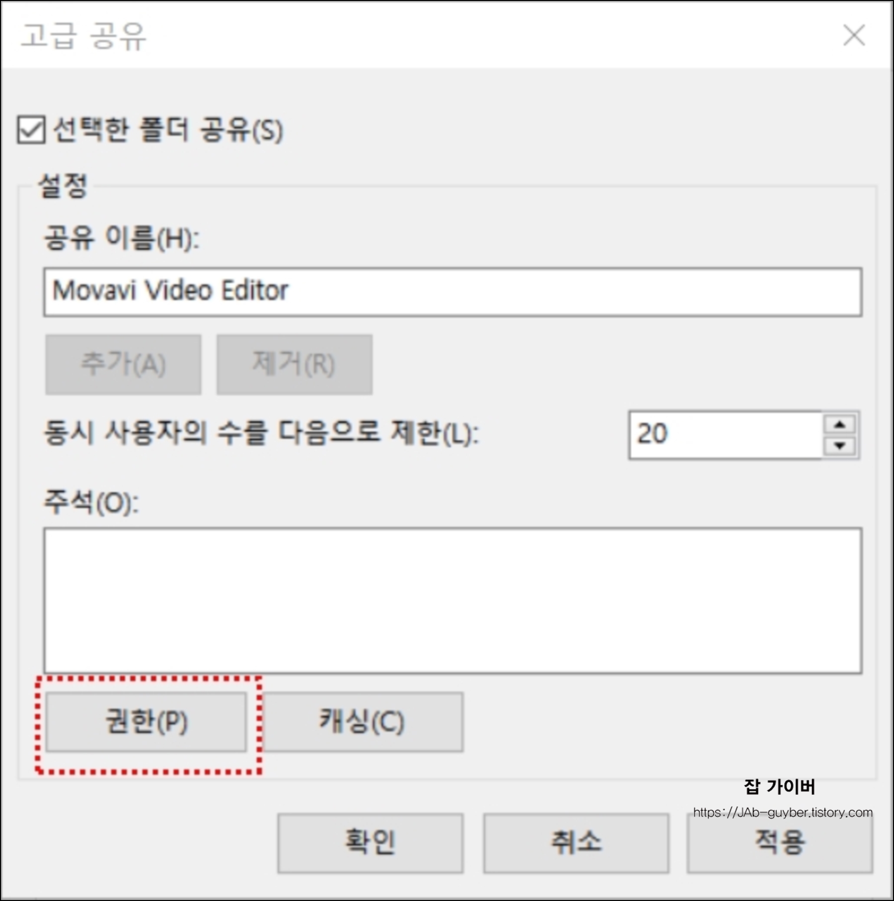 선택한 폴더를 공유하도록 설정 후 "권한"선택합니다.