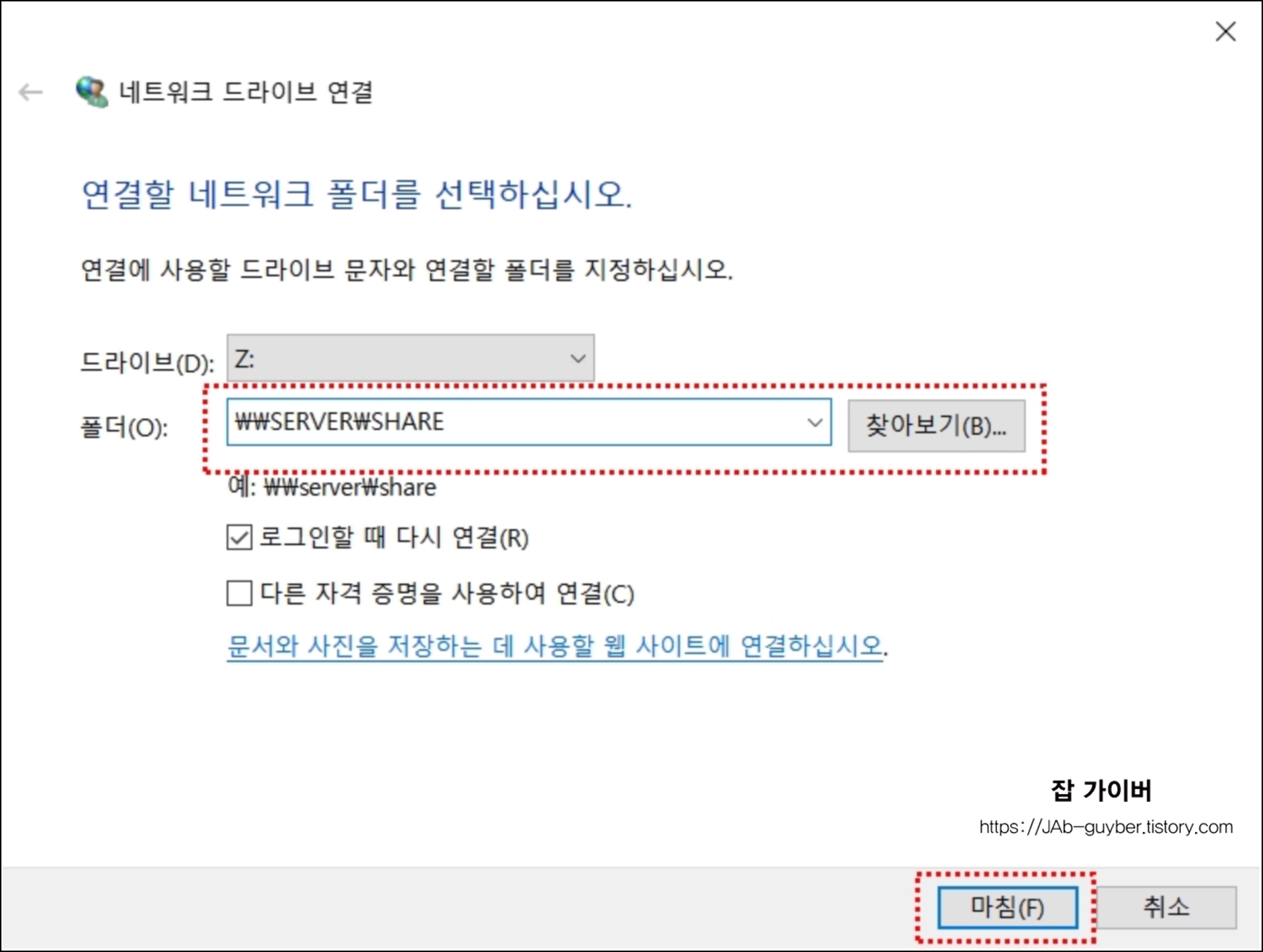여기서 공유하고자 하는 드라이브와 폴더를 입력 후 "마침"을 눌러주면 수동으로 네트워크 드라이브 설정이 완료됩니다.