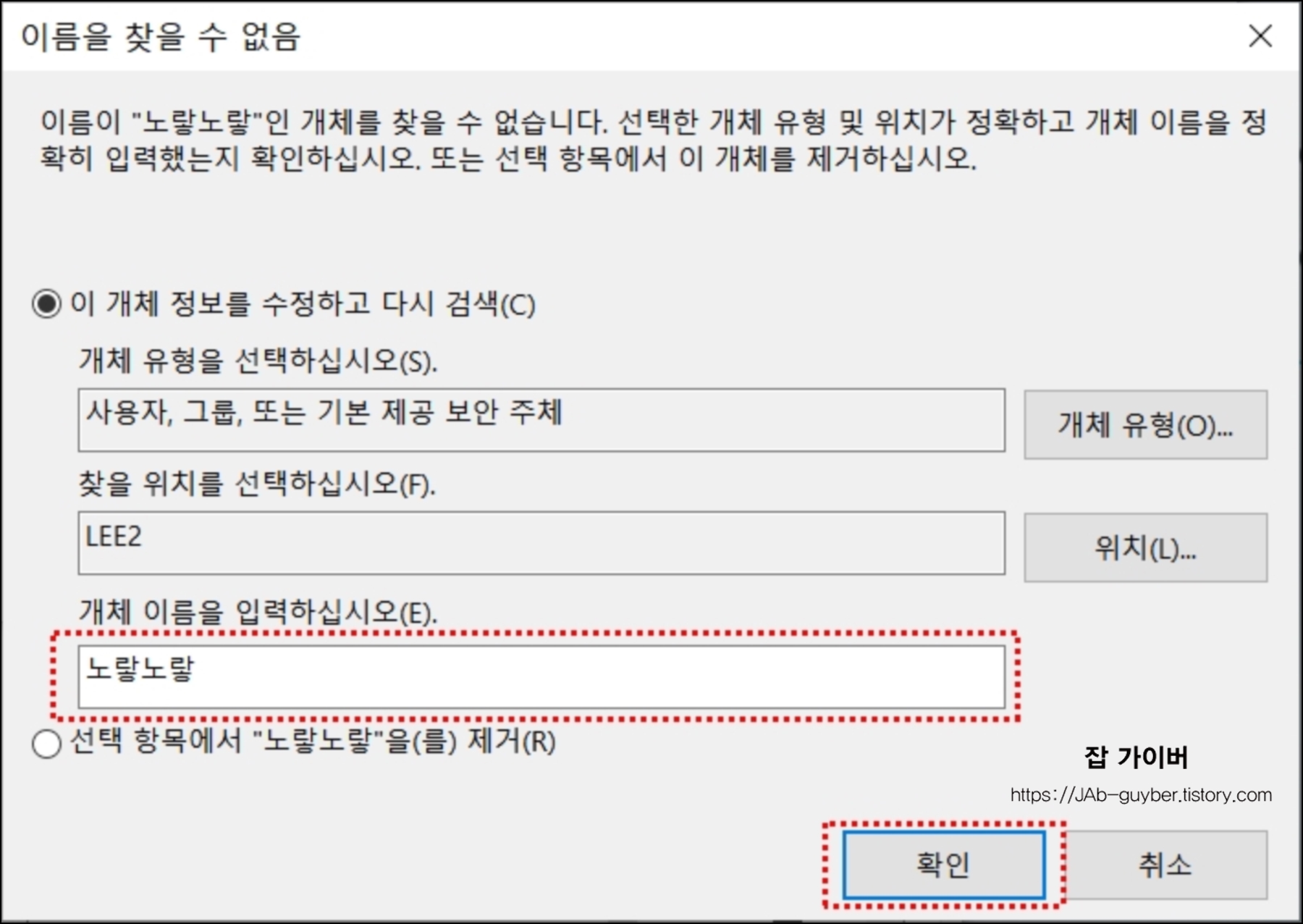 만약 개체 이름을 찾을 수 없다고 표시되면 선택 개체 유형 및 위치가 정확하고 개체 이름을 정확히 입력했는지 확인합니다.