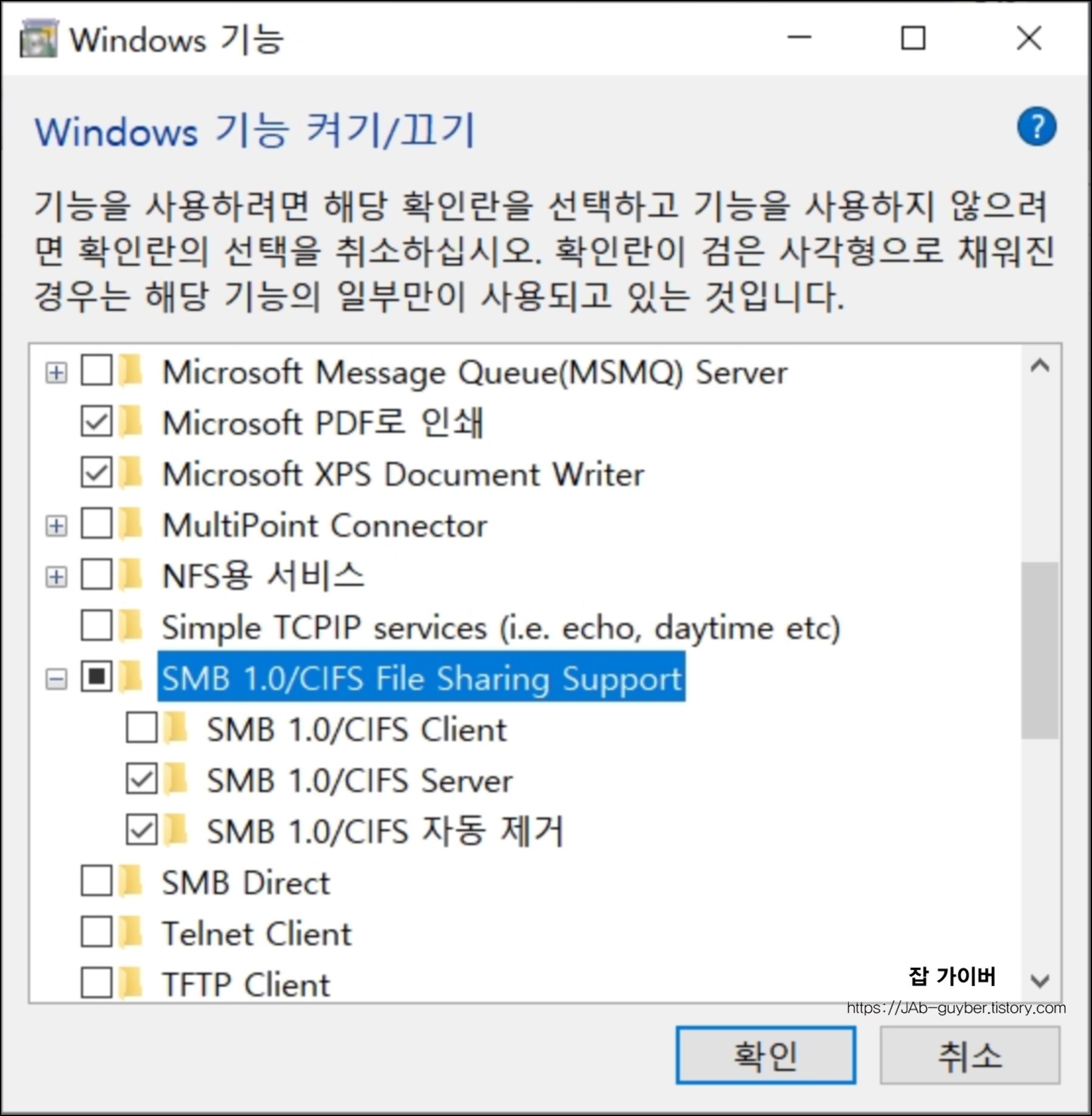 그럼 Windows 기능 항목에서 SMB 1.0 /CIFS File Sharing Support (SMB 1.0/CIFS 파일 공유 지원)이 체크가 되어 있는지 확인합니다.