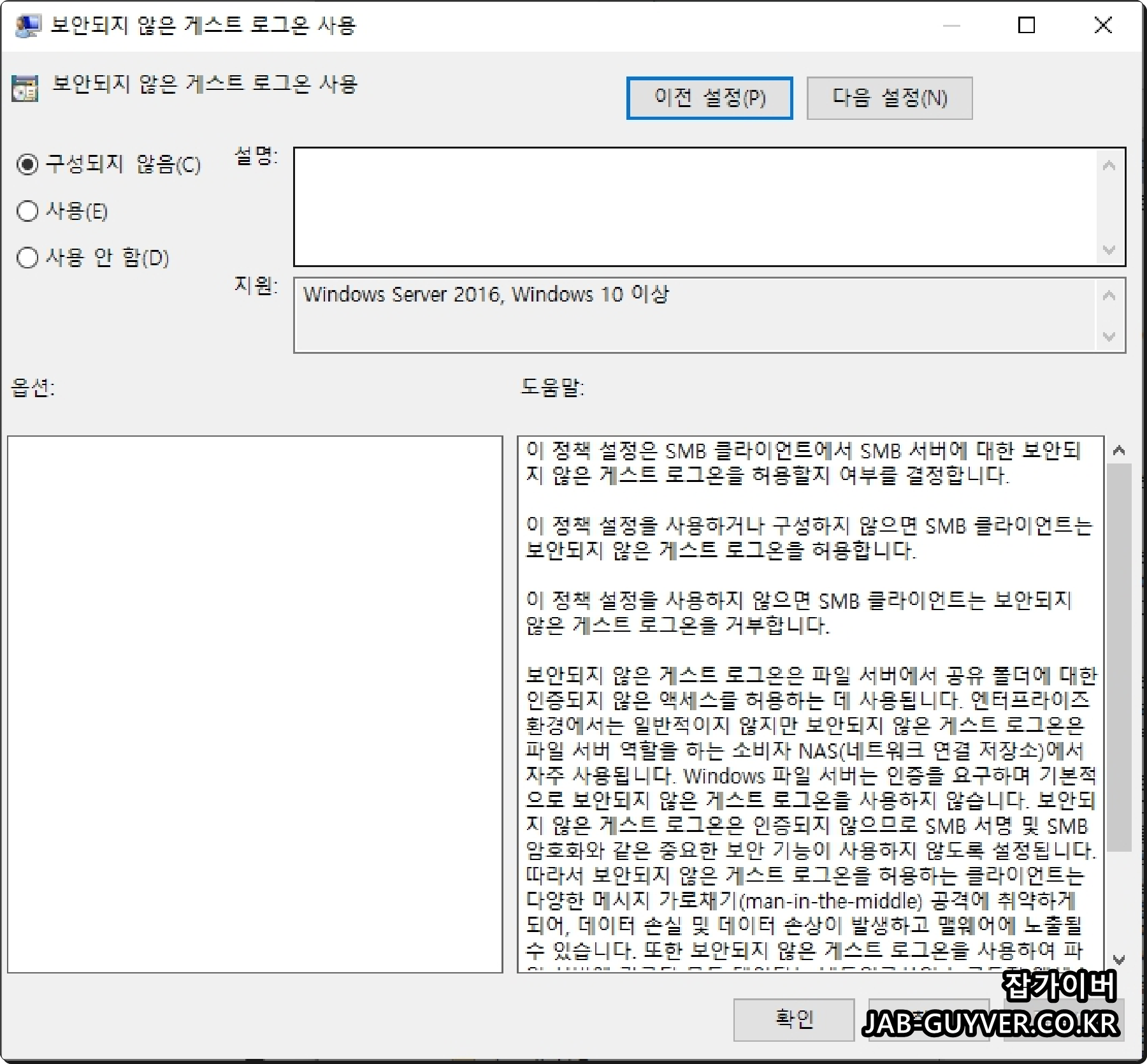 보안되지 않은 게스트 로그온 사용을 더블 클릭해서 구성되지 않음을 사용으로 변경합니다.