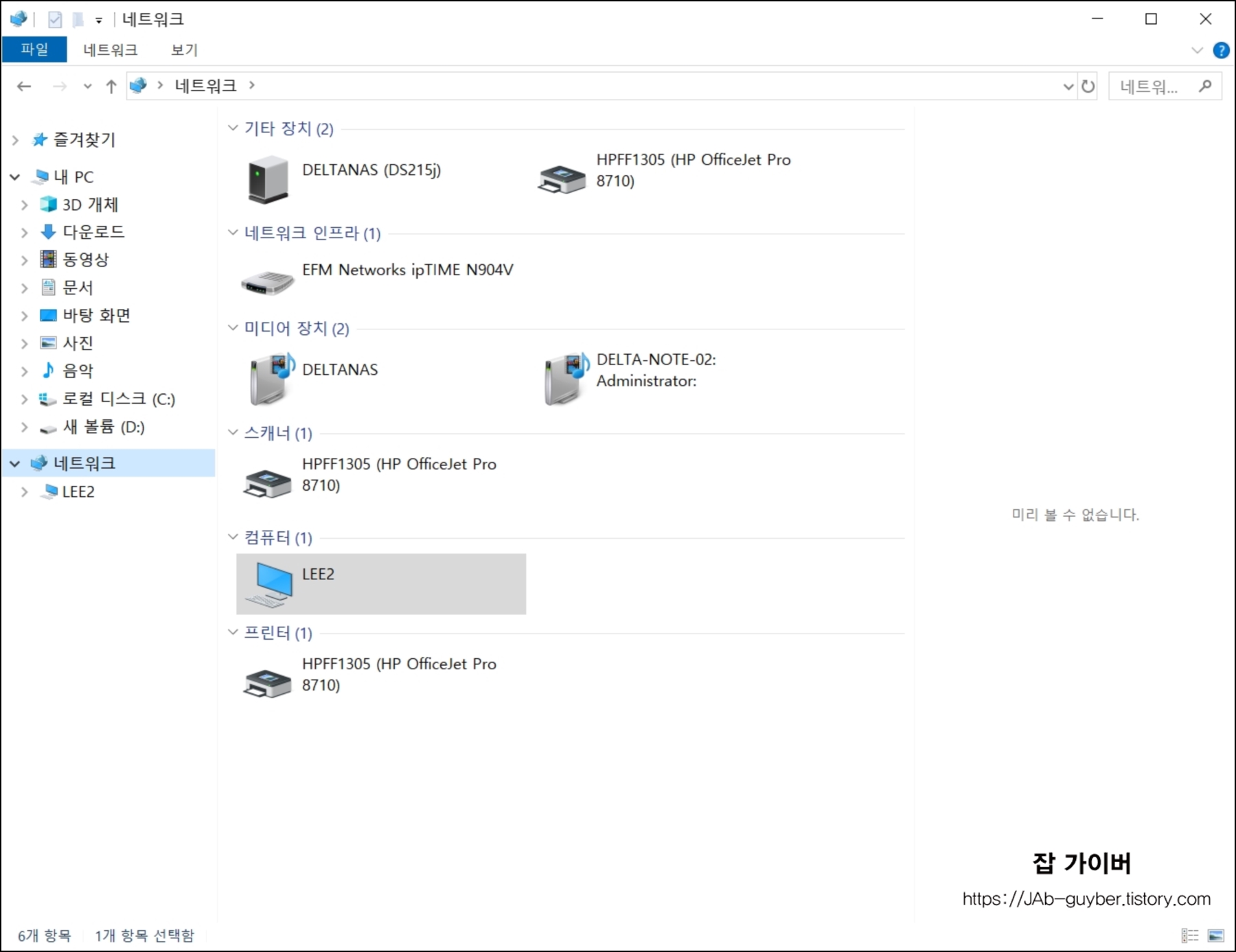 이후 네트워크 항목으로 들어가면 네트워크로 공유된 폴더나 드라이브 등등 기타 장치 등을 확인할 수 있으며 프린터도 함께 확인 가능합니다.