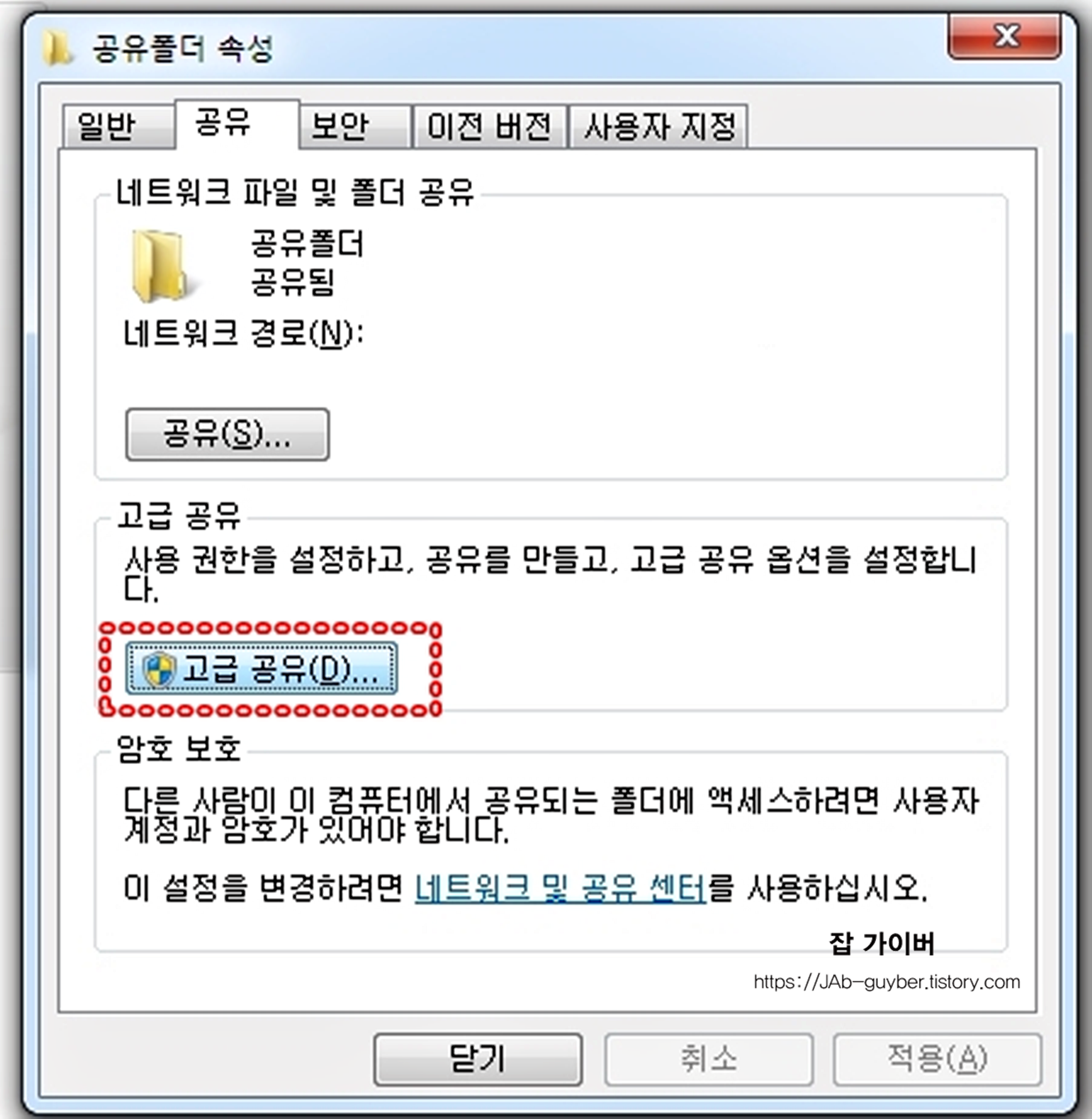 속성 창에서 공유 탭으로 이동하면, 간단 공유와 고급 공유를 선택할 수 있습니다. 팀 단위로 쓰거나 여러 PC가 물리는 환경이라면 “간단 공유로 대충 열어두는” 방식보다 고급 공유에서 대상을 확실히 잡는 쪽이 관리가 편합니다.
