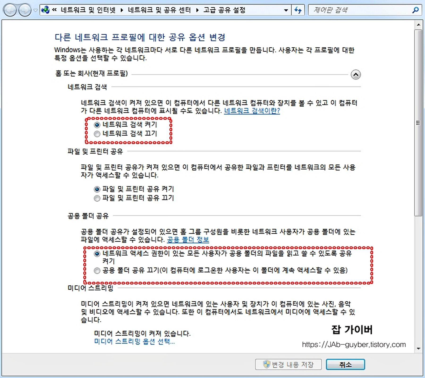 윈도우7에서 공유폴더 연결이 잘 되려면, 네트워크에서 서로를 찾을 수 있어야 하고, 공유 기능이 실제로 열려 있어야 합니다.