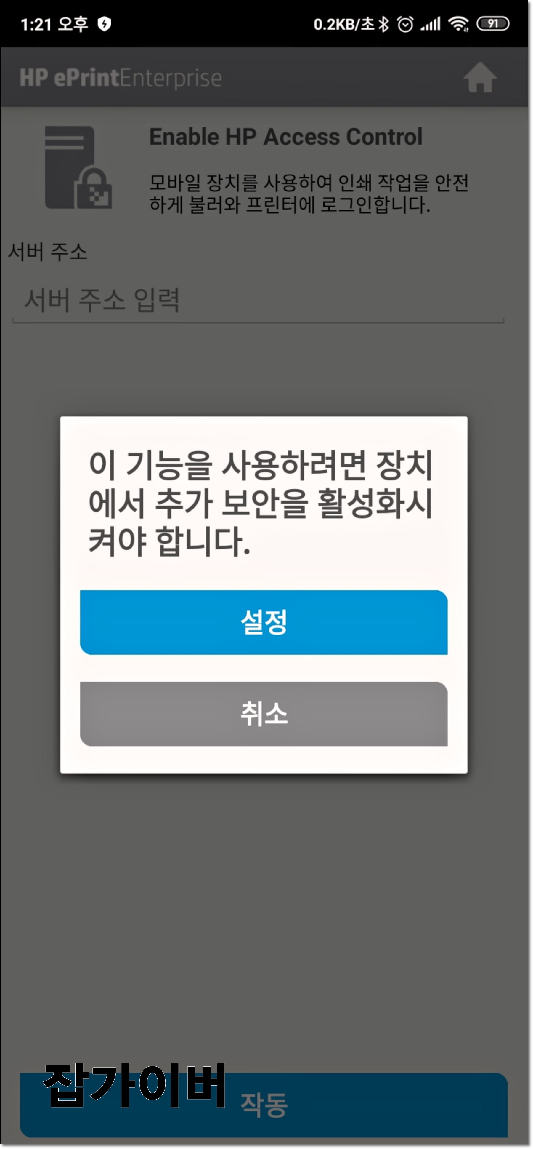 모바일 출력을 실행하면 프린터 서버의 호스트 이름과 IP주소를 입력해야 합니다.