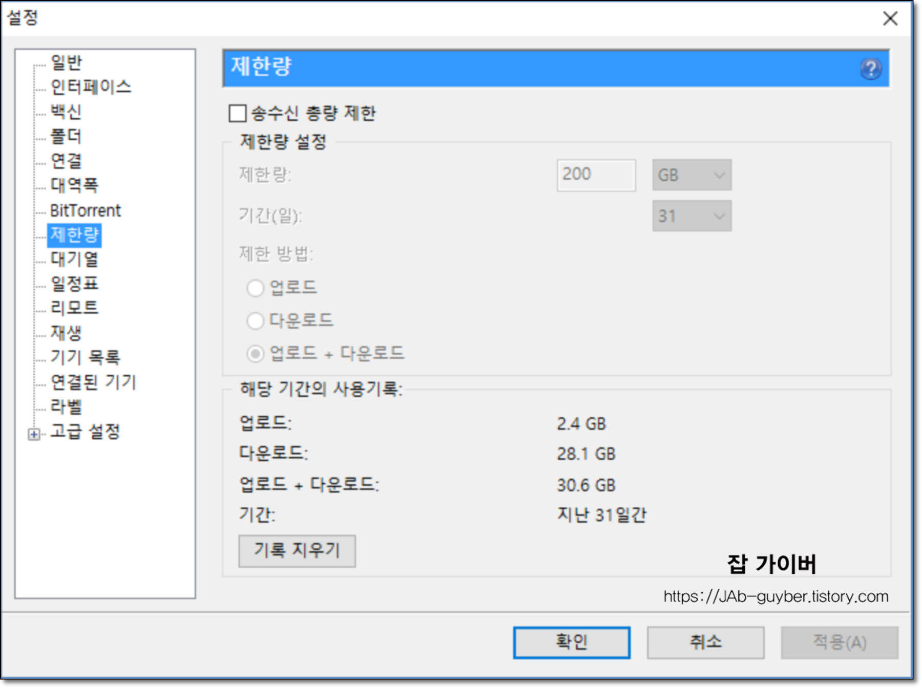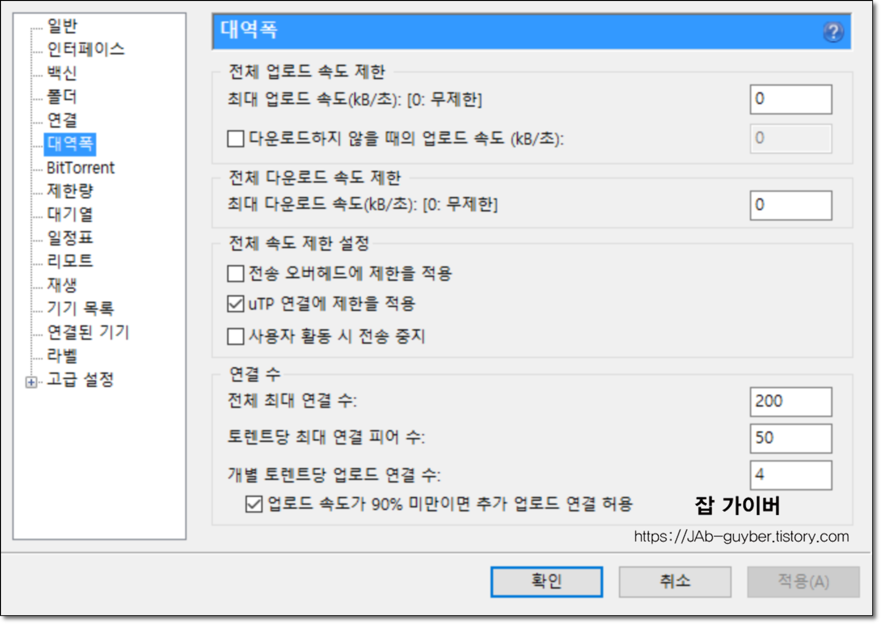 - 적절한 업로드 제한을 설정(예: 10~50KB/s)하고, 연결 수(피어 수)를 50~100 정도로 설정하면 속도 향상에 도움이 됩니다.