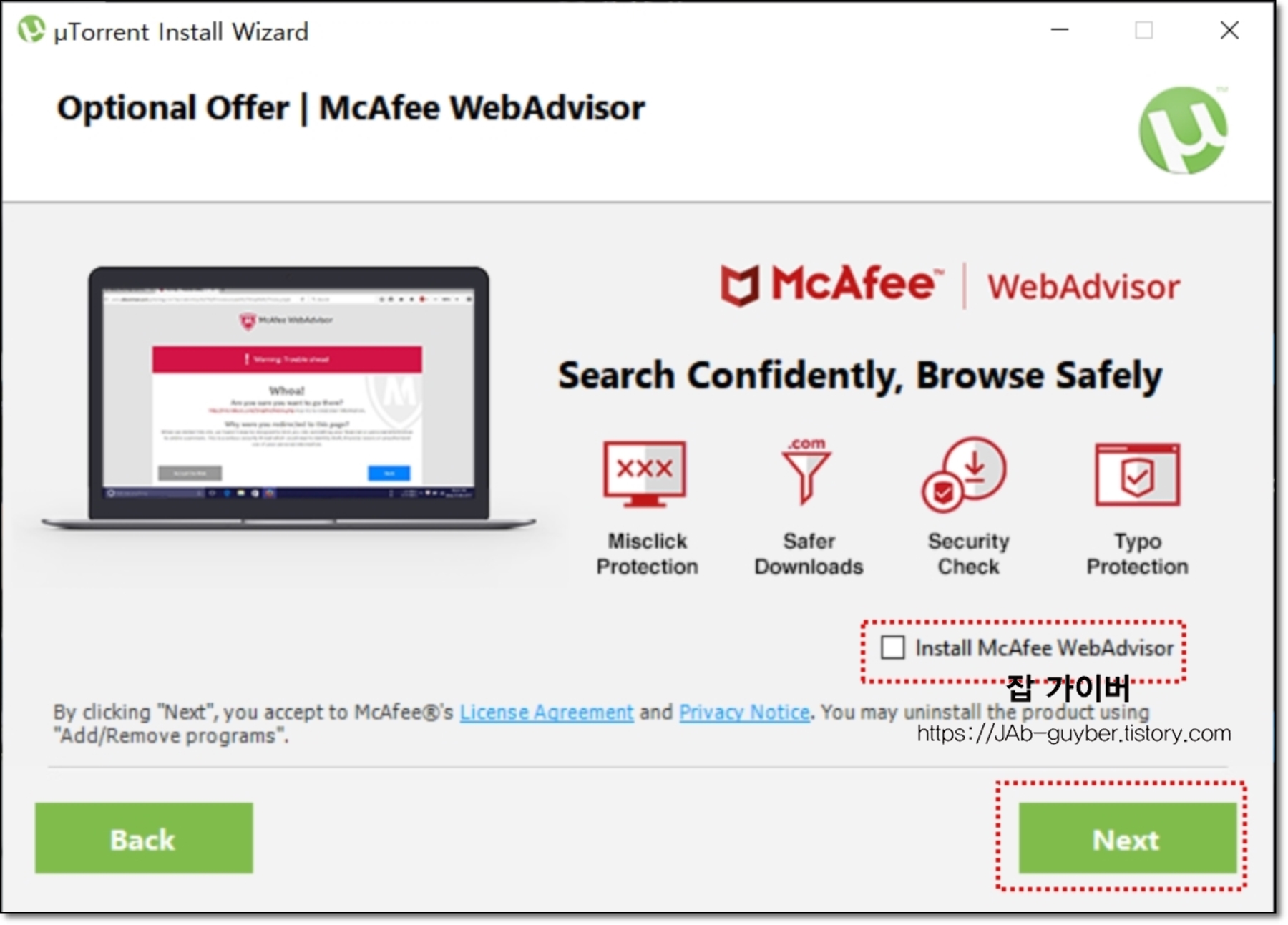 설치시 McAfee WebAdvisor 설치를 권장하지만 설치하고 사용할려고 하면 어차피 결제를 해야되기 때문에 설치시 체크를 해제하느것을 권장합니다.