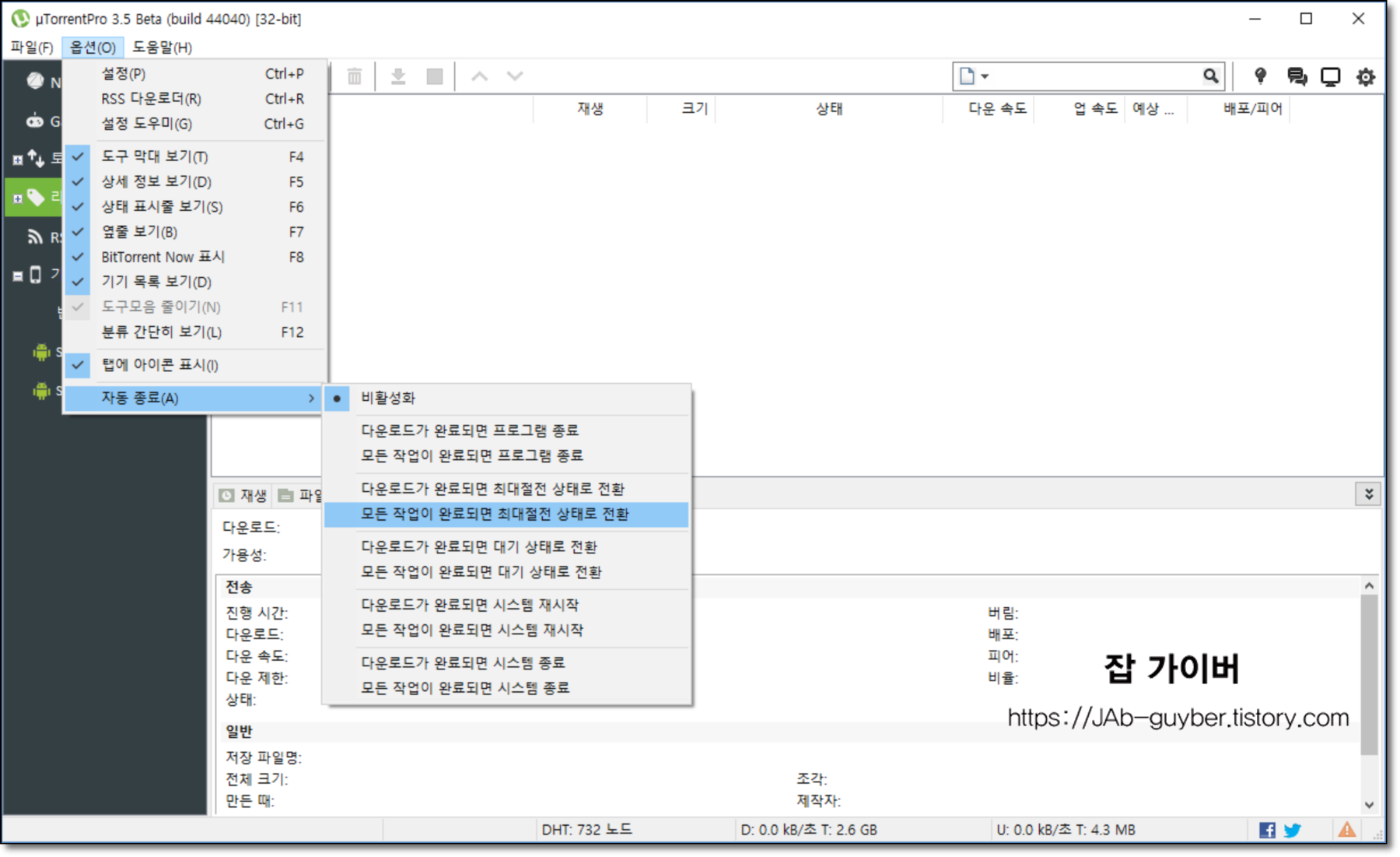 그런경우 옵션 -> 자동종료에서 파일이 다운로드 완료가 되면 자동으로 토렌트가 꺼지거나 컴퓨터가 종료되게 설정하는것이 좋습니다.